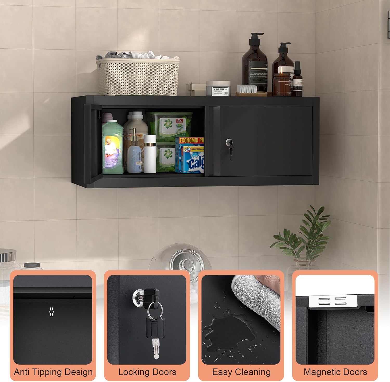 LUCYPAL Garage Storage Cabinet,Metal Wall Storage Cabinet with Locking Doors for Workshop,Kitchen,Steel Tool Hanging Cabinets for Warehouse,Home Office,Black,12.8''H