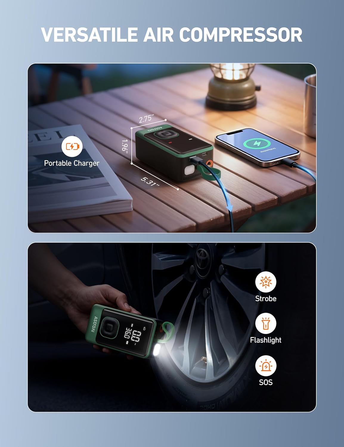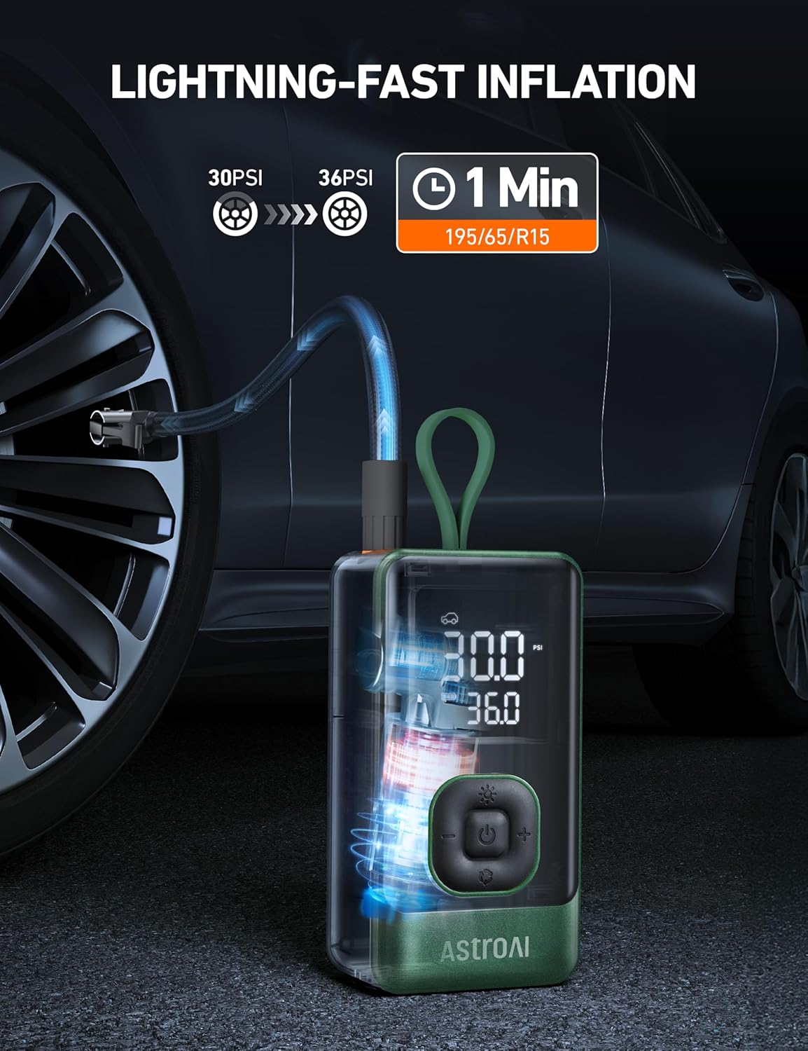 AstroAI L7 Air Tire Inflator Portable Air Compressor, 150PSI Electric Cordless Pump with Fast 1-min Inflation, Auto Shutoff, LED Light – Rechargeable for Car, SUV, Motorcycle, Bike Tires (Green)