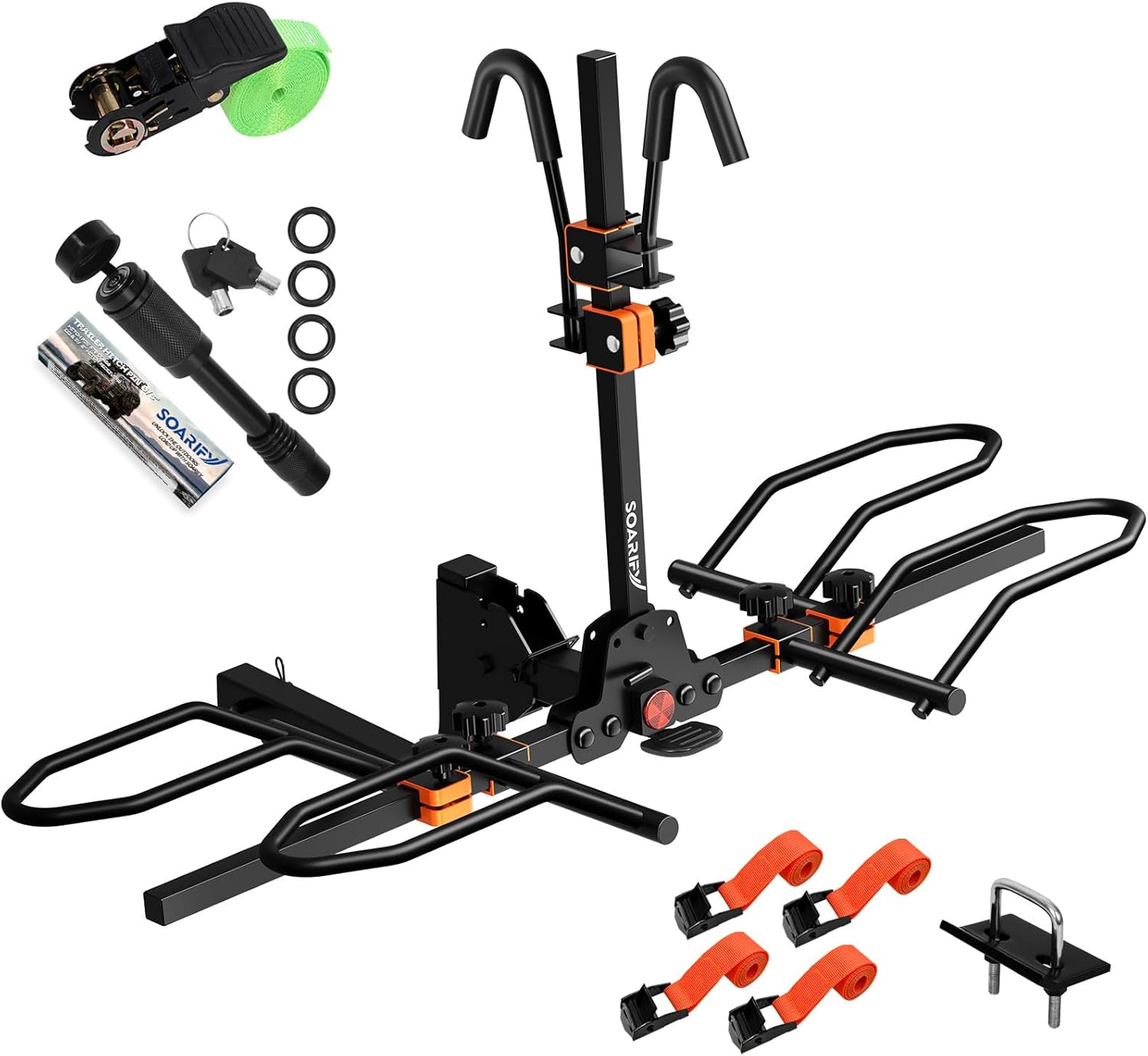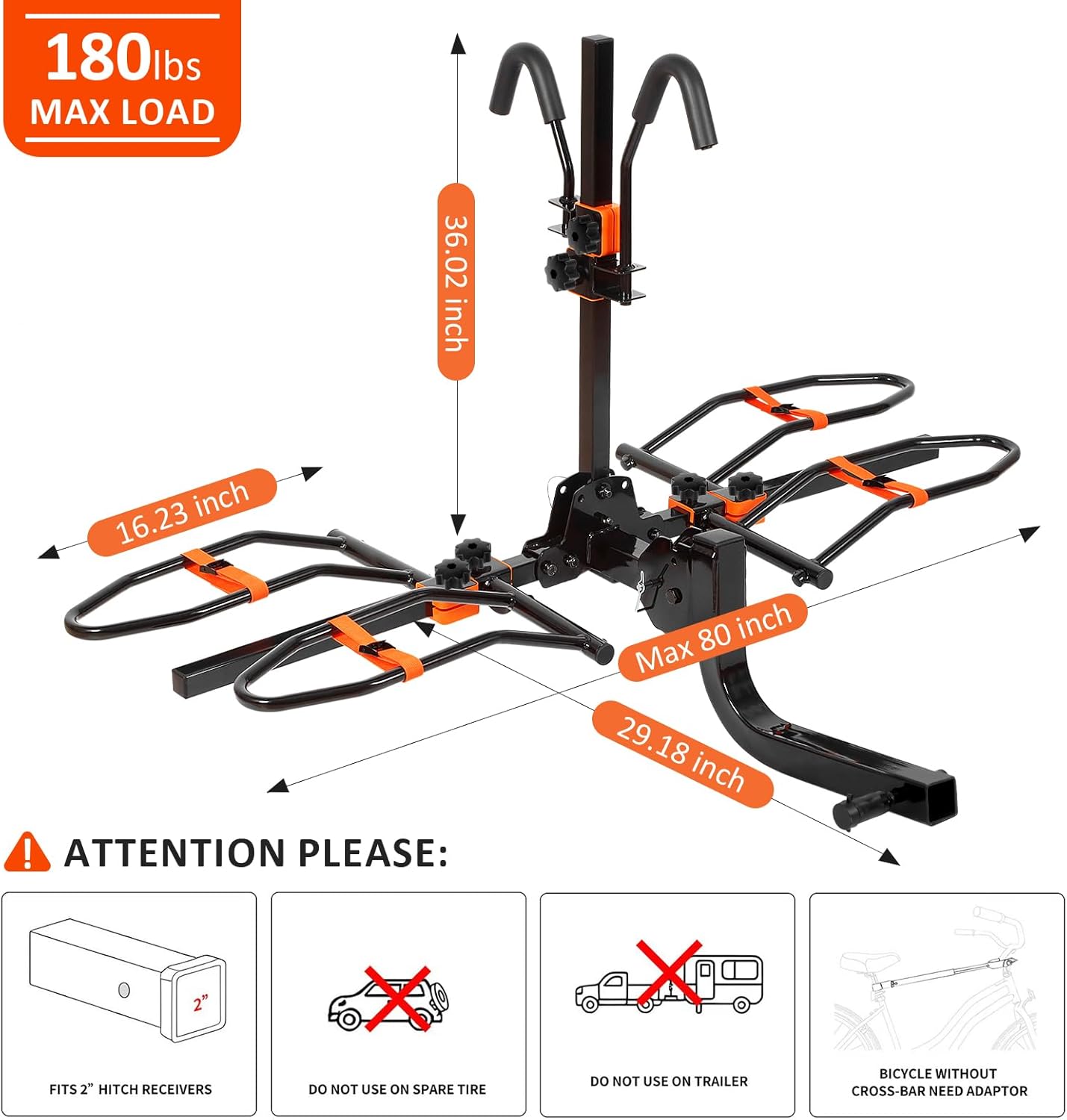 - 🚴【HEAVY-DUTY CONSTURCTION】: Built with high-strength alloy steel to support up to 180 lbs, accommodating two bikes of various sizes and types, including eBikes, mountain bikes, and road bikes.