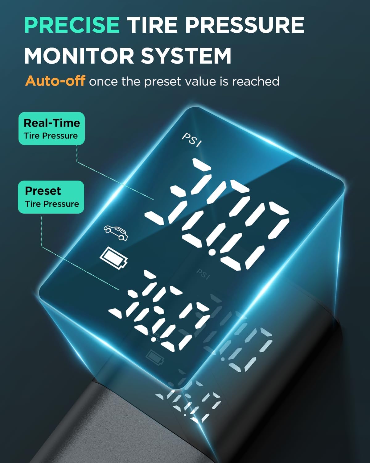 - OVERHEAT PROTECTION: Our air compressor portable is equipped with advanced overheat protection to ensure safety and extend the lifespan of the product. If the internal temperature exceeds safe limits due to prolonged use or a high ambient temperature, the system will automatically shut off to protect our small air pump. Recommended: Fully charge before heavy-duty inflation tasks.