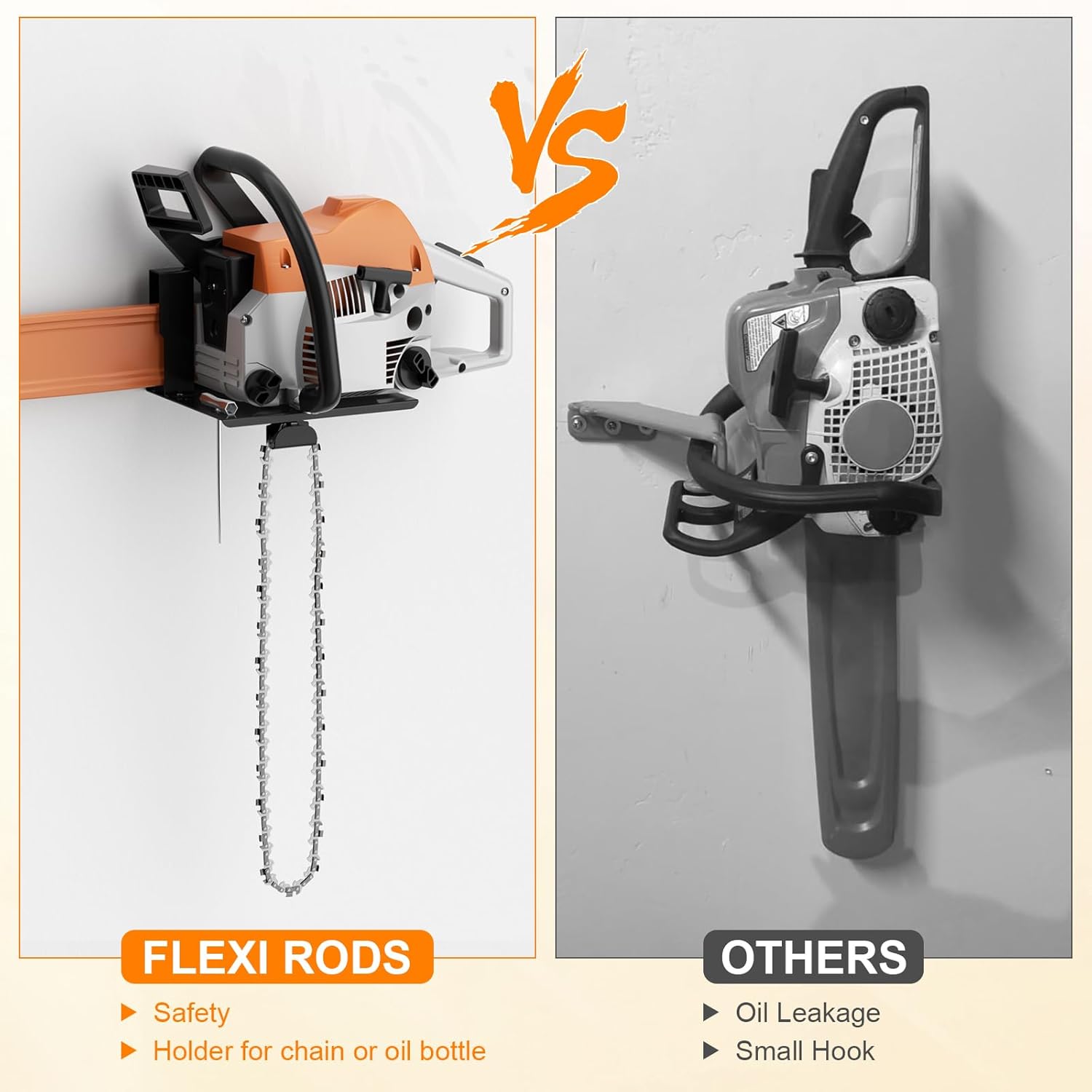 - Enhanced Safety Features: Unlike vertical mounts that can cause oil leakage from chainsaws, our design holds your chainsaw in a more secure position to prevent oil from spilling. Enjoy peace of mind knowing that your tools are stored safely and cleanly