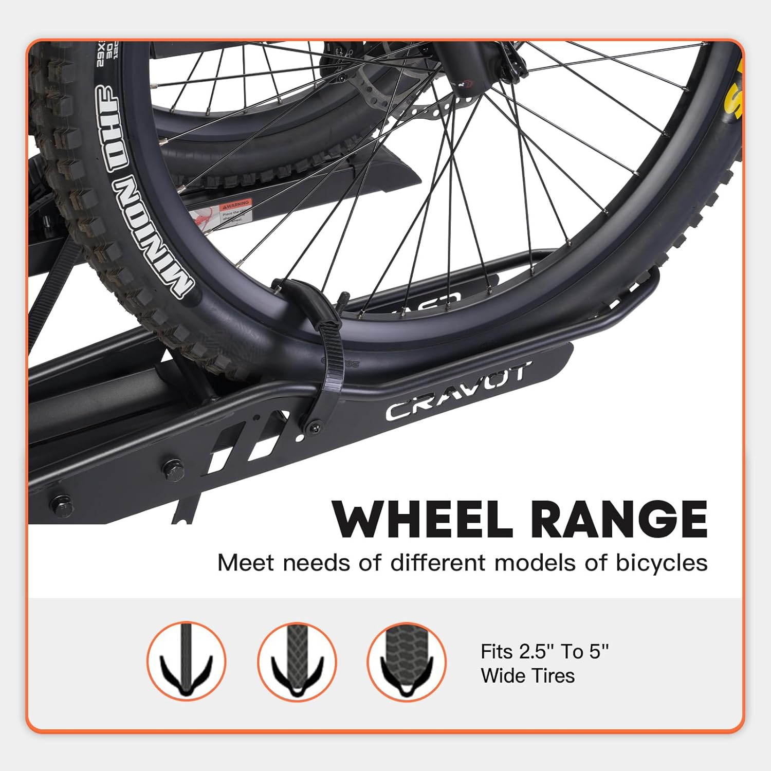 - 300lbs Capacity: CRAVOT heavy ebike rack with a ramp, is possible to hold up to 300lbs in total, or 150lbs per ebike or heavy bike. Fitting any vehicle equipped with a 2-inch receiver and accommodating ebikes up to 5'' wide and with a wheelbase up to 50''.