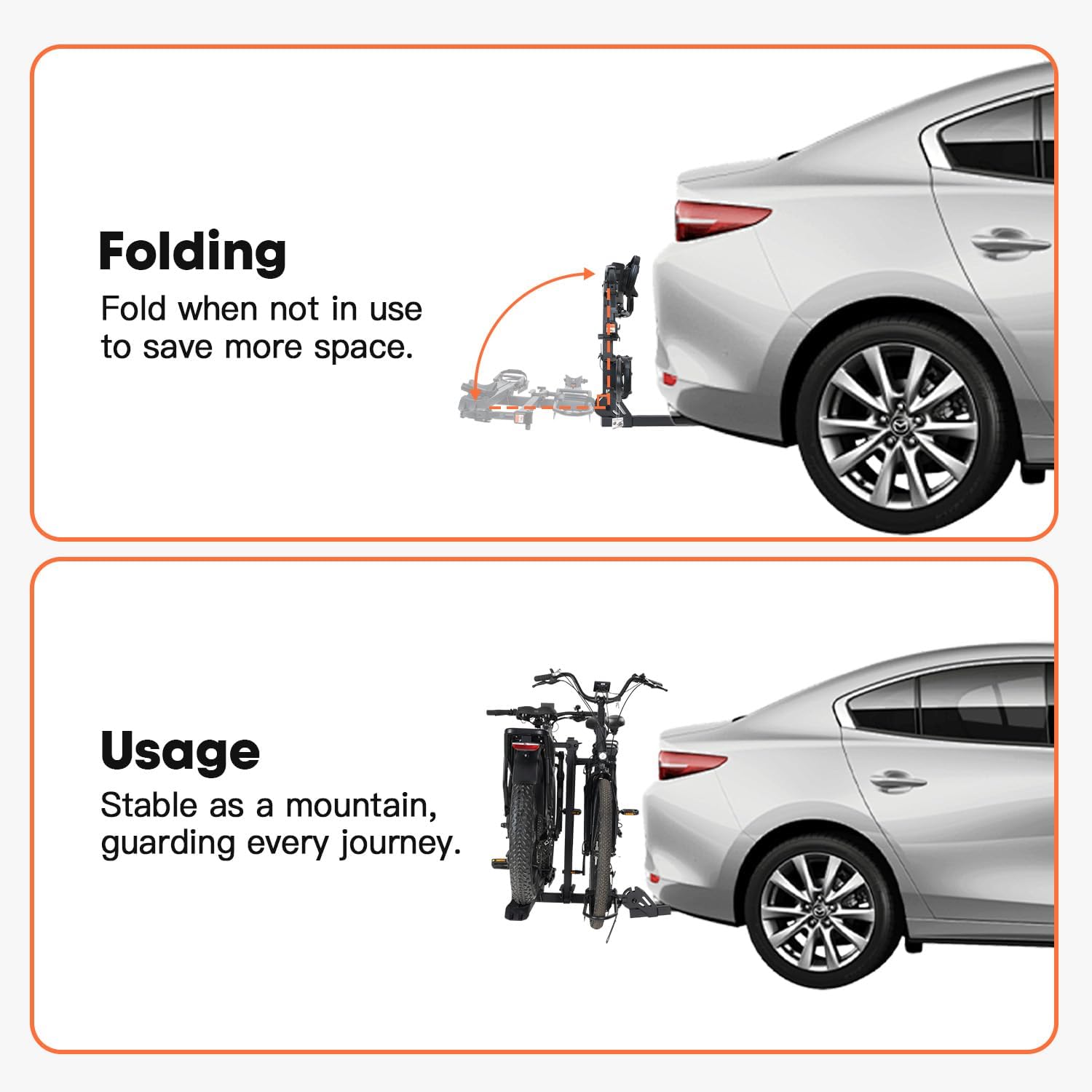 - Enhanced Stability: Our updated new version E2 with 2-inch fat tire ebike hitch rack now includes a V-shaped front wheel cradle, accommodating a variety of tire sizes. With its sturdy bolt system and shock-absorbing threads, this fat tire ebike hitch rack ensures unparalleled stability on any terrain.