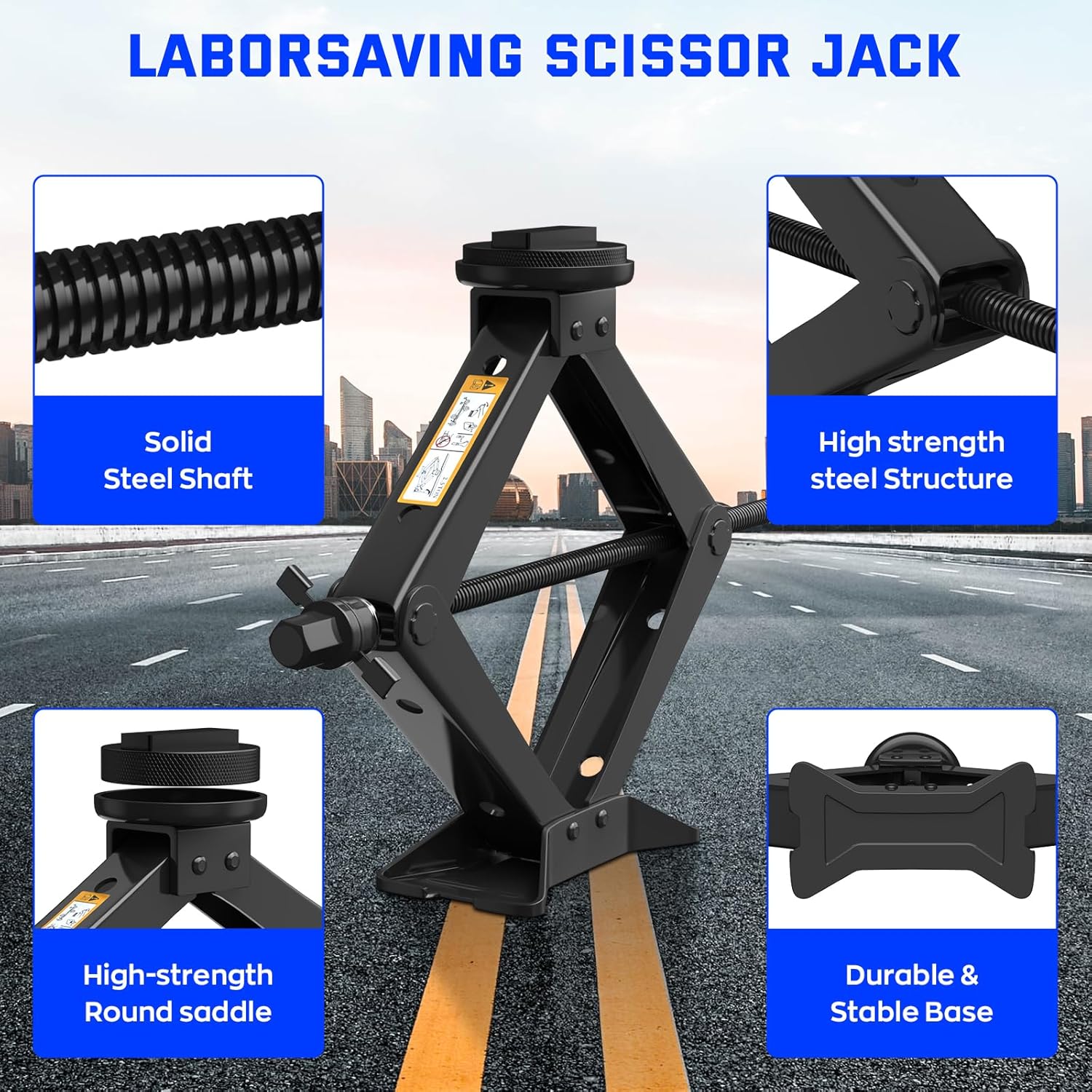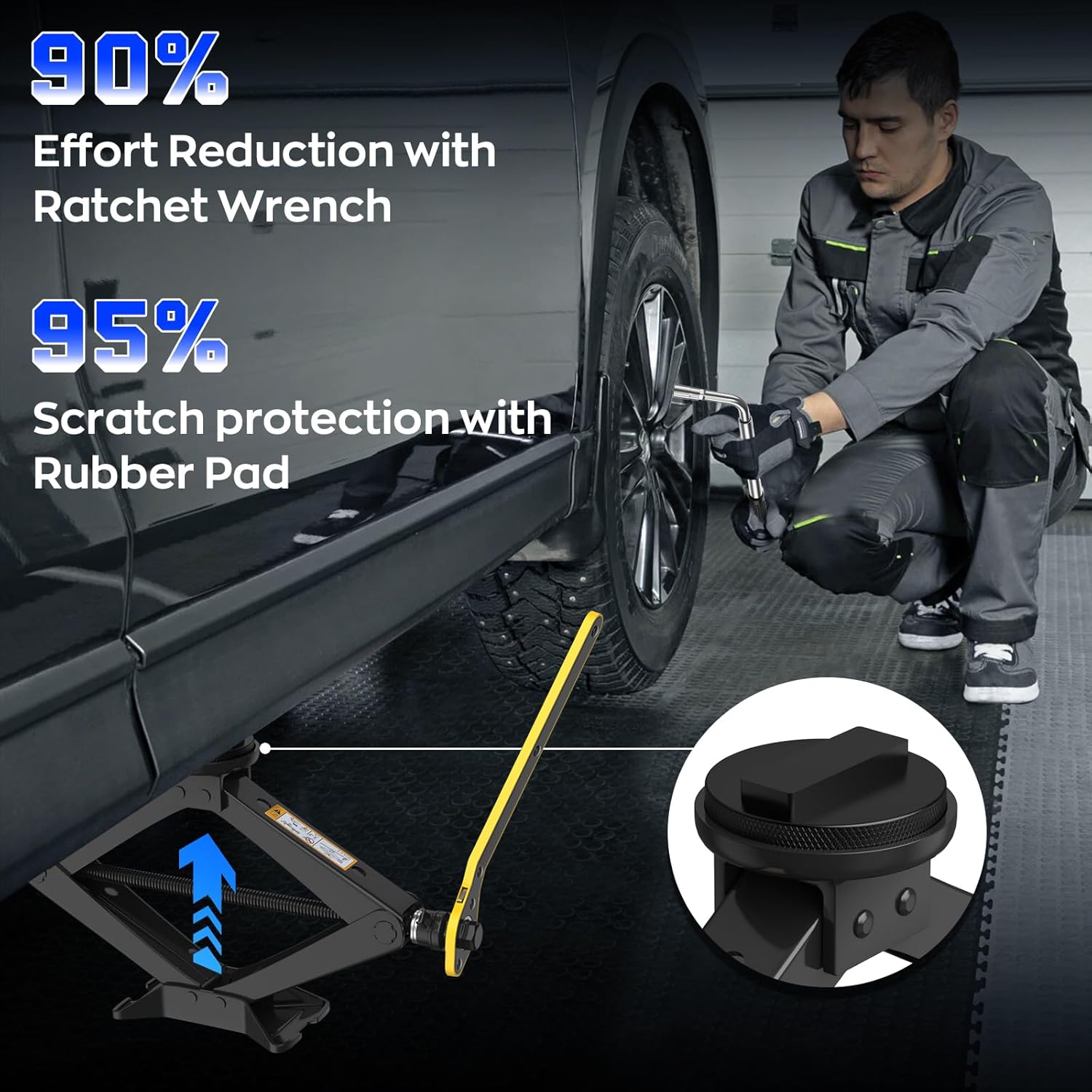 - 【Durable and Reliable】This car jack kit is made of high-strength cold-rolled steel with an enlarged base that ensures its stability during lifting; the jack comes with two non-slip Jack rubber pads that match it, which protects the car from steel beam scratches while lifting.