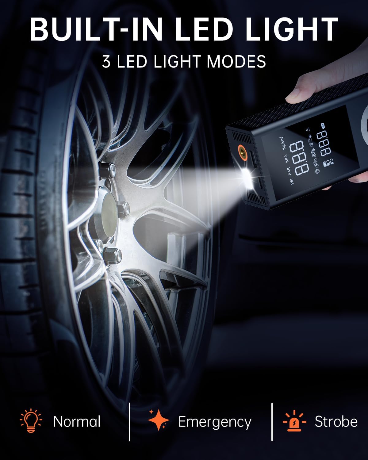 - Powerful and Durable: The air pump is built with high-quality materials, ensuring durability and superior performance. With a maximum pressure of 150 PSI, it inflates tires 2x faster than standard 120 PSI pumps, offering quick and efficient inflation. This portable inflator is perfect for cars, SUVs, motorcycles, and bicycles for easy inflation. (Not suitable for large truck tires.)