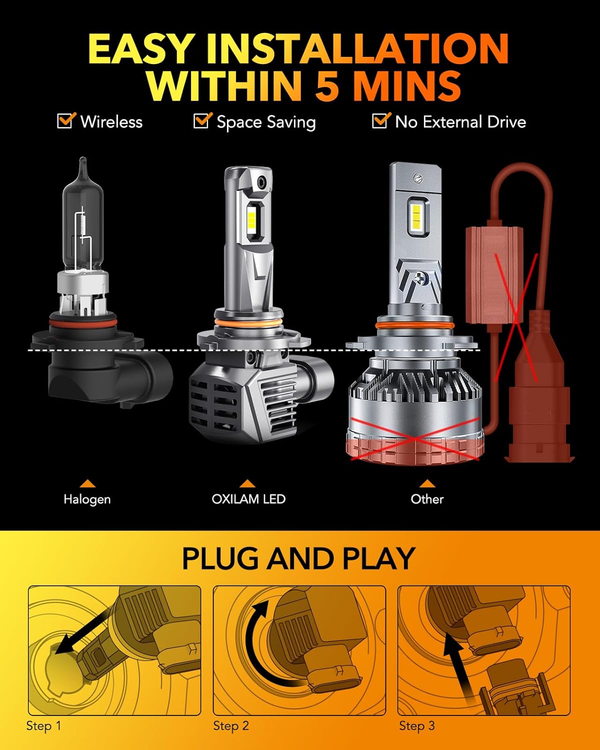 - Easy Plug-and-Play Installation: Upgrade to OXILAM 9005 and 9006 bulbs effortlessly with a simple installation process. Their compact, integrated design requires no modifications, allowing you to complete the installation in just 10 minutes and seamlessly connect to existing halogen sockets