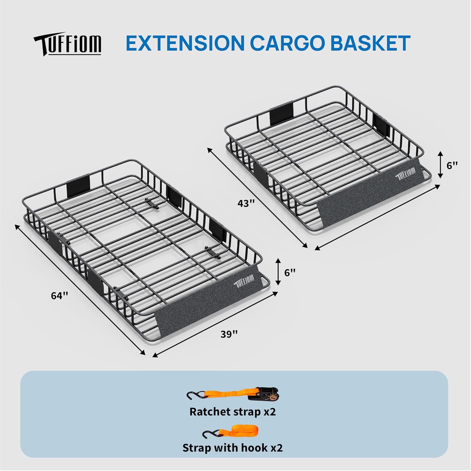 TUFFIOM 64"x 39"x 6" Universal Rooftop Cargo Carrier Basket, Extendable Steel Roof Rack Basket w/Straps with Hook, Heavy Duty Car Top Rack Luggage Holder Carrier Basket for SUV Car Truck Van