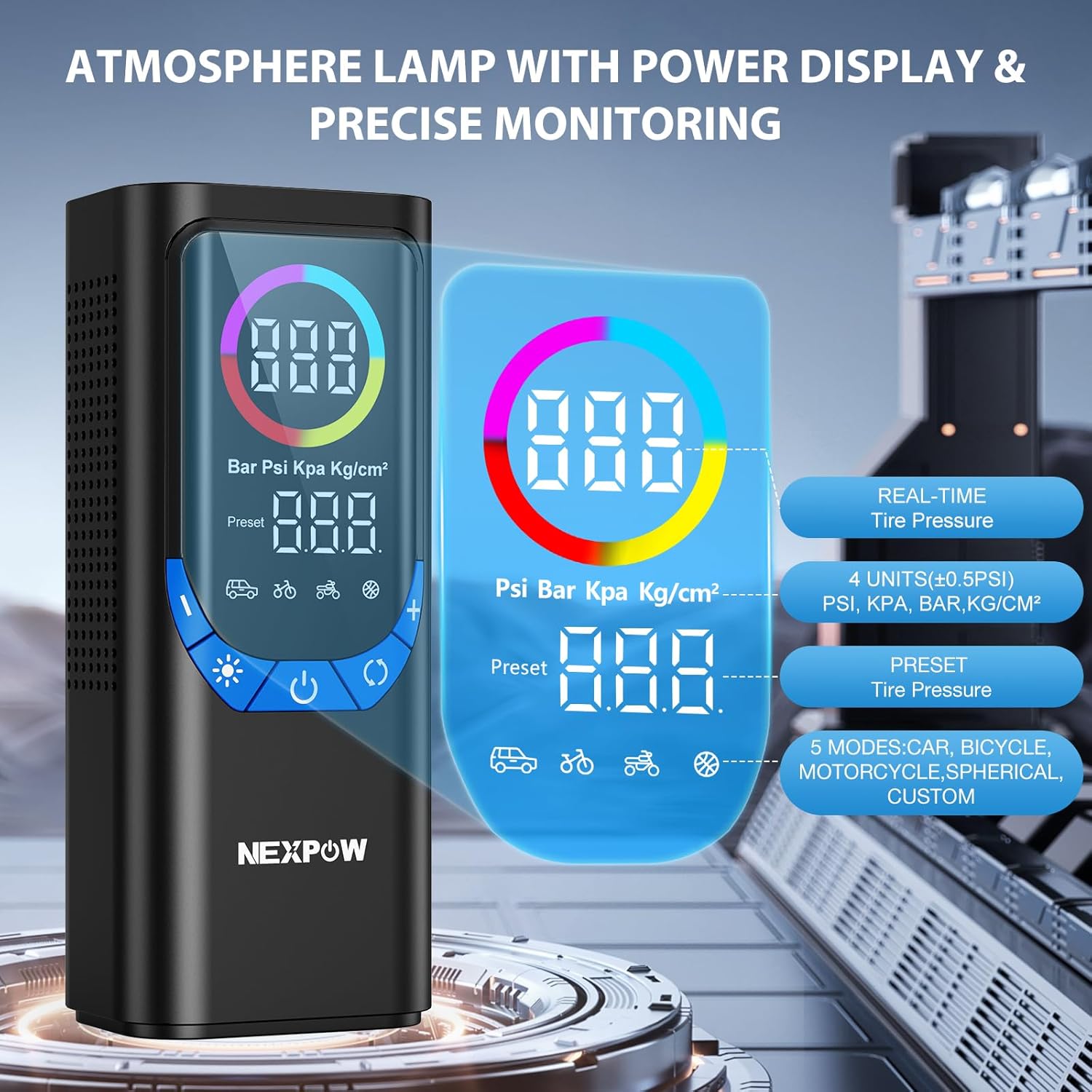 - EASY TO USE & AUTO SHUT-OFF: With 4 preset inflation modes and a custom mode, the NEXPOW car air pump is easy to use even for a new beginner. The large digital display helps you read the tire pressure just at a glance. Besides, the auto shut-off function ensures the inflator stops once the preset pressure is reached, preventing over-inflation and delivering precise results every time. Just set it and let it do the work!