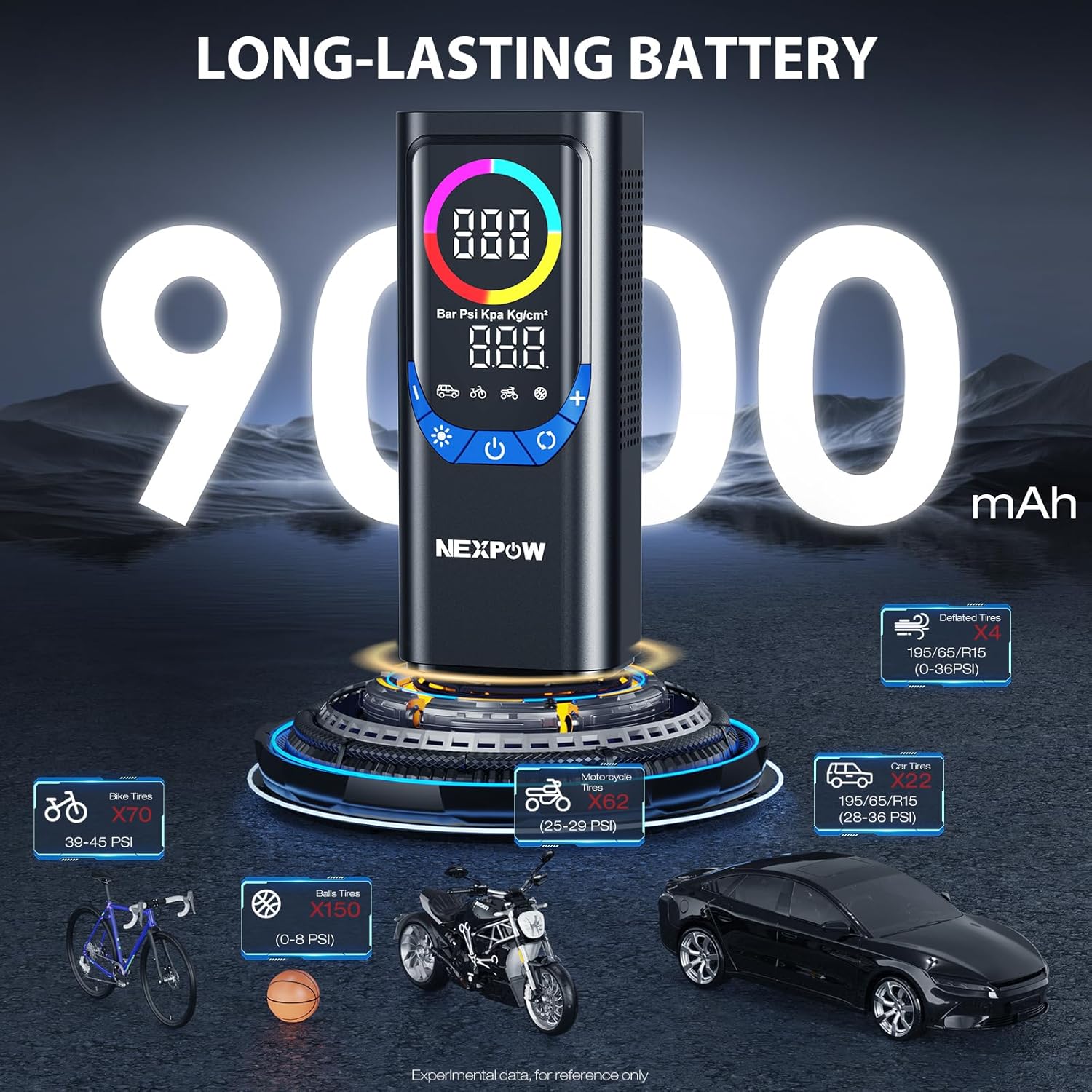 - 4X FASTER INFLATION: NEXPOW portable air pump is born with a powerful motor and a high-performance chip, providing a maximum pressure of 150PSI and a strong airflow. This portable tire inflator for cars can pump up a standard car tire from 30 to 36PSI in less than 1 minute, offering 4X faster inflation than others. It can save you valuable time in emergencies or routine maintenance.