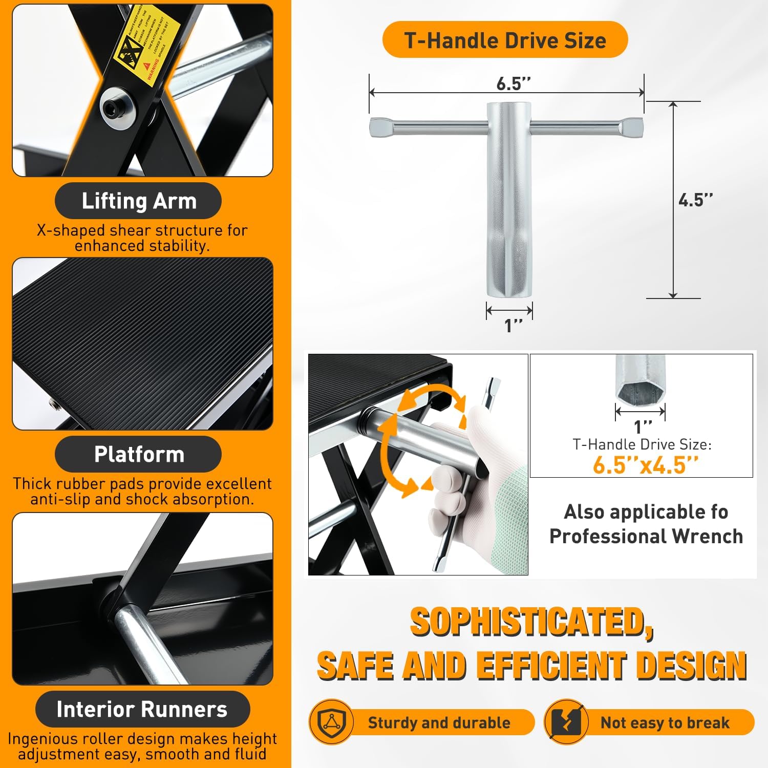 - EASY TO OPERATE: Lift adjustable height ranges from 3.4 inch to 14.2 inch. With no additional tools required, motorcycle scissor lift can be easily lifted and lowered by turning the included removable crank handle to raise the bike or motorcycle to the desired height for maintenance, repair or storage. Do not use an impact wrench or powered drill to operate the lift