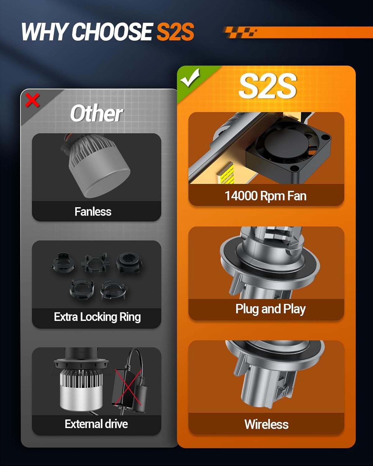 - Wide View And Safer: The S2S H13 fog bulb is equipped with advanced smart IC drives with radiating distances of 1600F, 40000 lumens and 6500K cool white, ensuring a clearly visible driving experience at night. Made of high-speed cooling fans and single copper tubes, our bulbs keep low operating temperatures and provide reliable performance at night for longer life of over 50,000 hours.