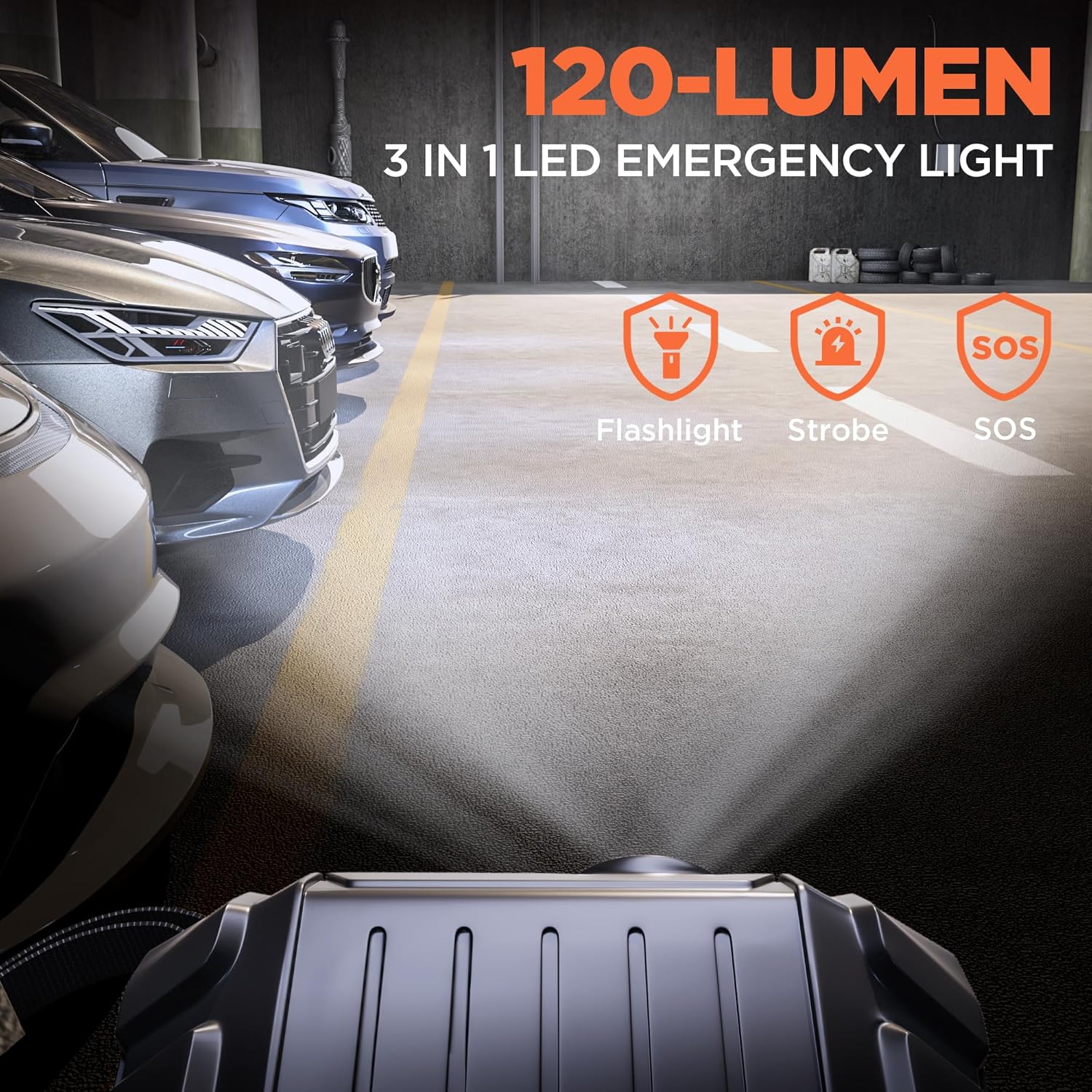 - 120 Lumens Emergency Light & Portable Handle: This jump starter power pack features a bright 120 lumen emergency light (400%+ brighter), lasting up to 72 hours. It offers 3 upgraded light modes (flashlight/strobe/SOS), perfect for various emergencies like night lighting, warning, and roadside repairs. Its humanized design includes a sturdy, portable carrying handle