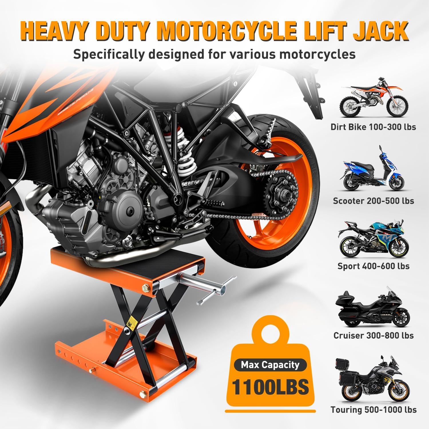 - HHEAVY DUTY MOTORCYCLE LIFT: Nilight motorcycle jacks features the heavy-duty and sturdy steel structure with a 1100 lbs / 0.5 ton lifting load capacity. This heavy duty motorcycle jack will help you lift motorcycles or dirt bikes with ease, fit for Harley Davidson and more motorcycle. Great for use in the garage, shop or track for your repair or cleaning