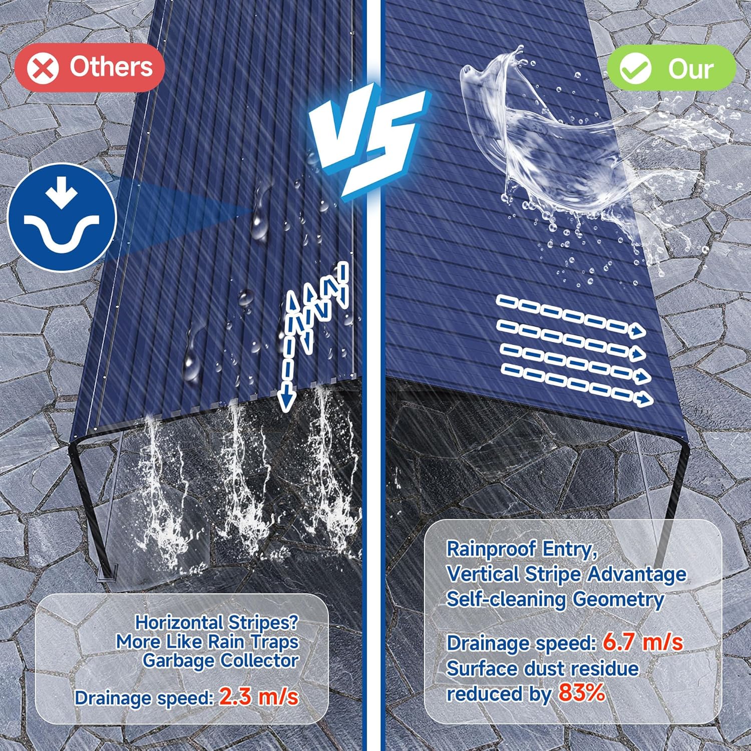 - Self-Cleaning Drainage System: An innovative vertical groove design promotes rapid rainwater runoff and minimizes debris accumulation, keeping your carport clean and low-maintenance. Durable galvanized panels and sealed roof connectors ensure long-lasting weather resistance.