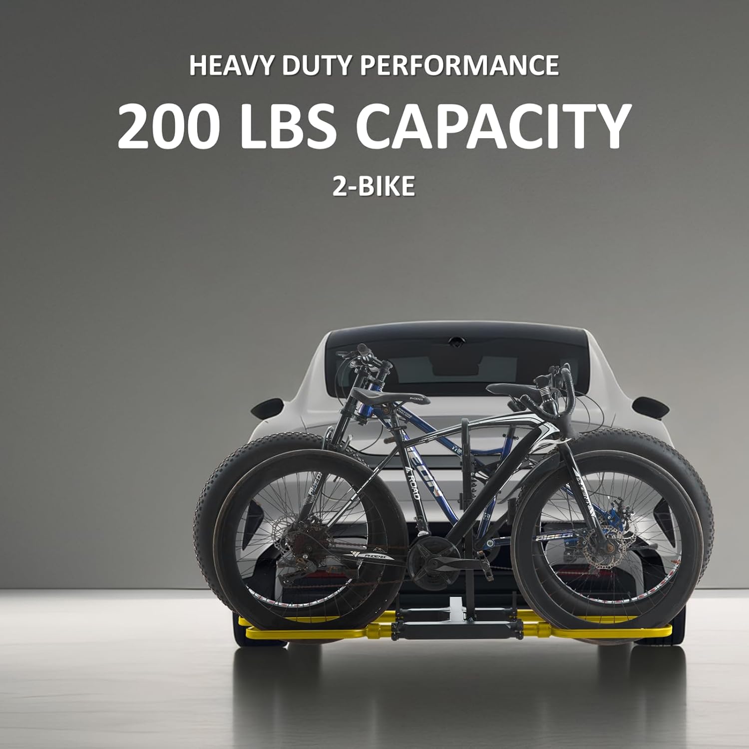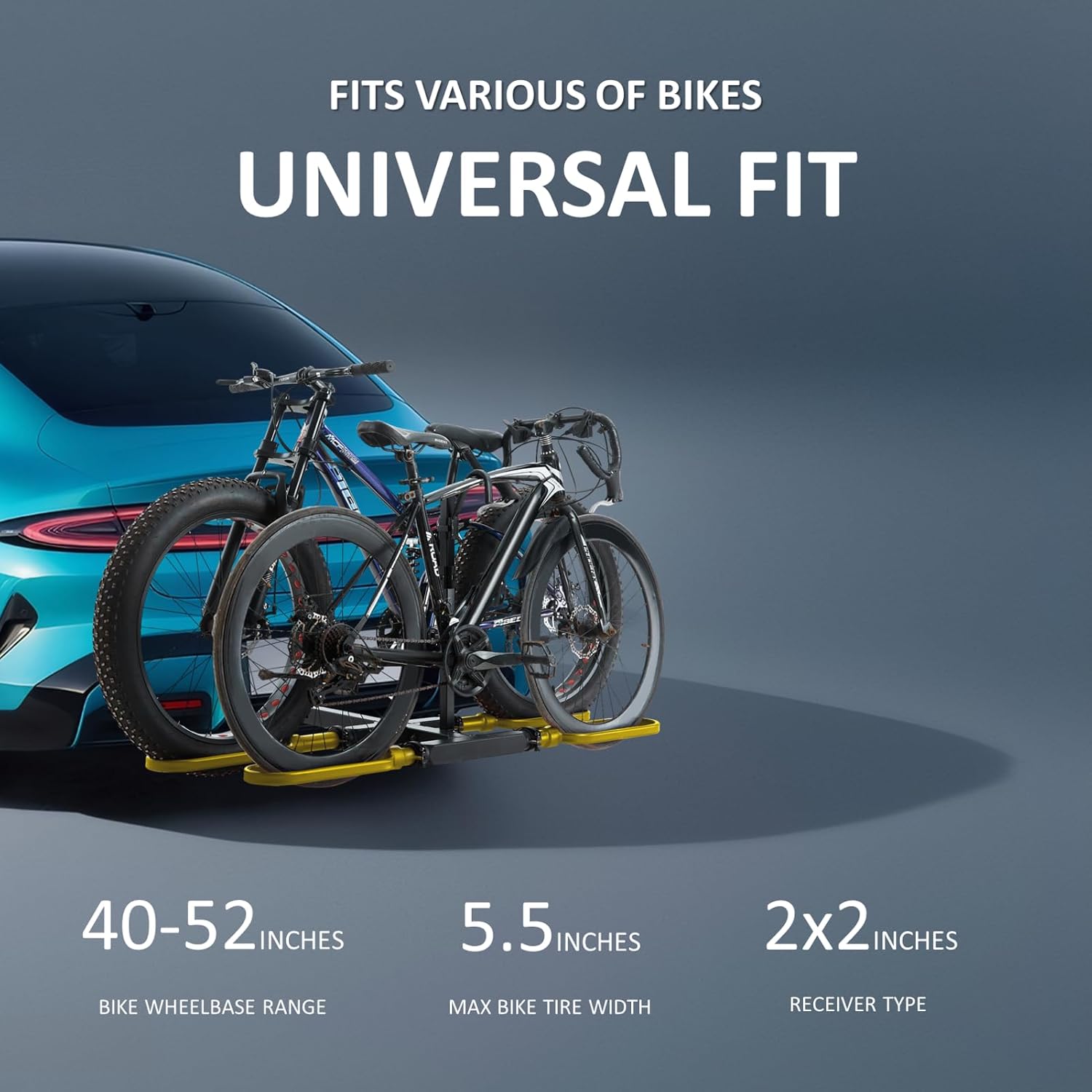 - Fits 2 Heavy-Duty Bikes: Elevate your outdoor trips with our robust aluminum hitch bike rack. It supports 40-52” wheelbase, tires up to 5.5”, and total 2-bike weight of 200 pounds. This makes it an excellent fat tire bike rack, and secure ebike rack. It also carries mountain, road, fat-tire ebike, electric bicycles etc.