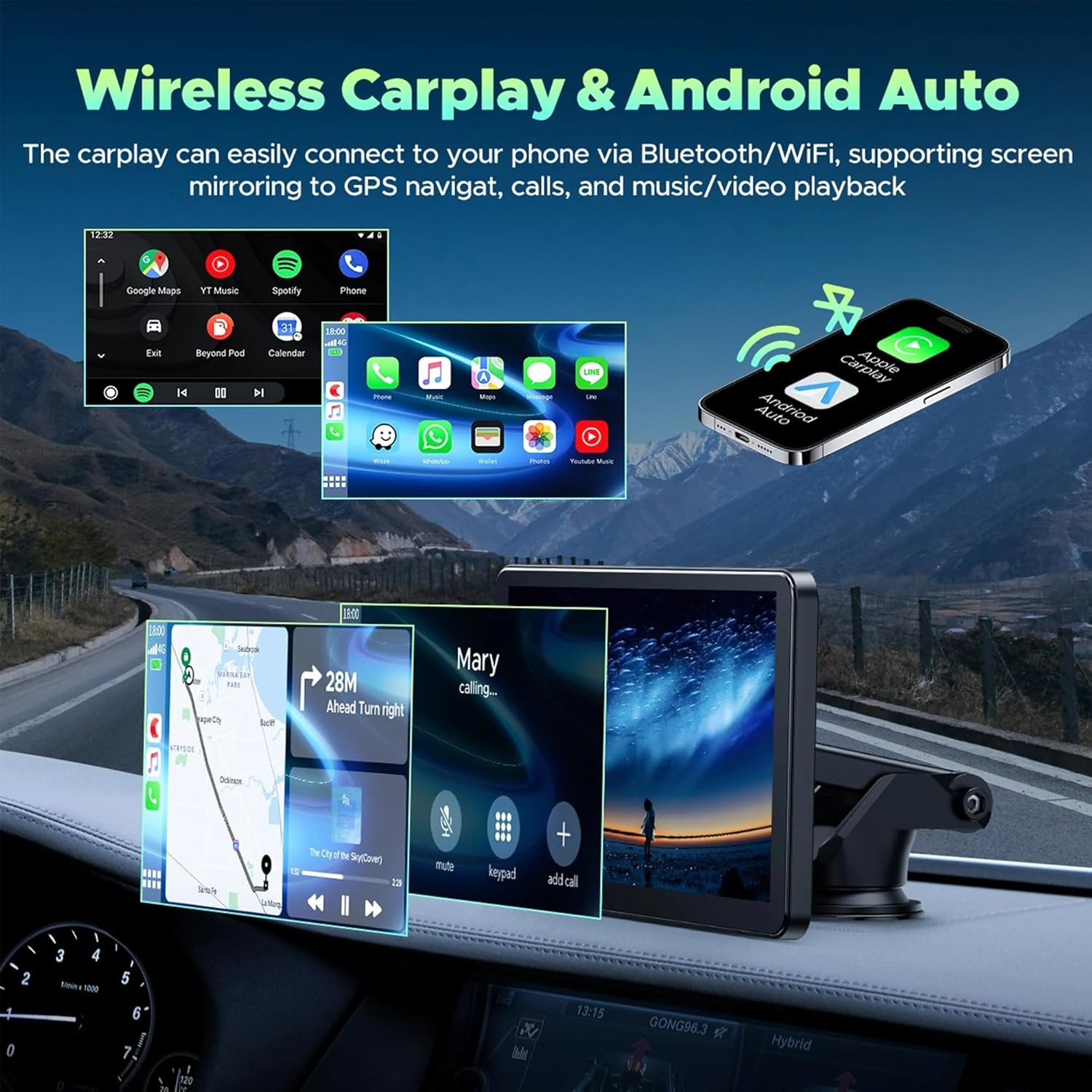 Portable Wireless CarPlay and Android Auto Screen for Car, 7" HD Touch Screen Car Stereo with Mirror Link, Bluetooth 5.0, Backup Camera, AUX,FM Transmitter for All Vehicle (with Camera)