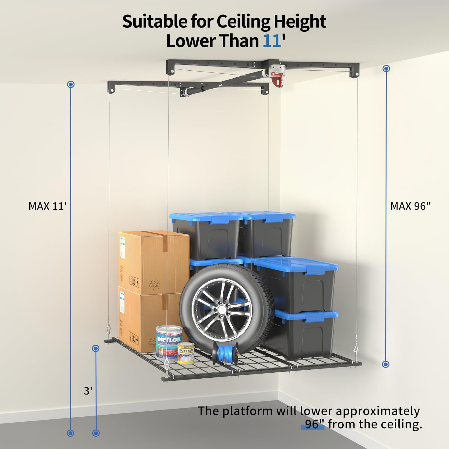 - Innovative Design for Easy Access: Elevate your garage organization with this overhead garage storage lift. Unlike traditional garage storage shelves, KOKORACKER product allows for effortless access, making storing and retrieving items a breeze, without the need for ladders.