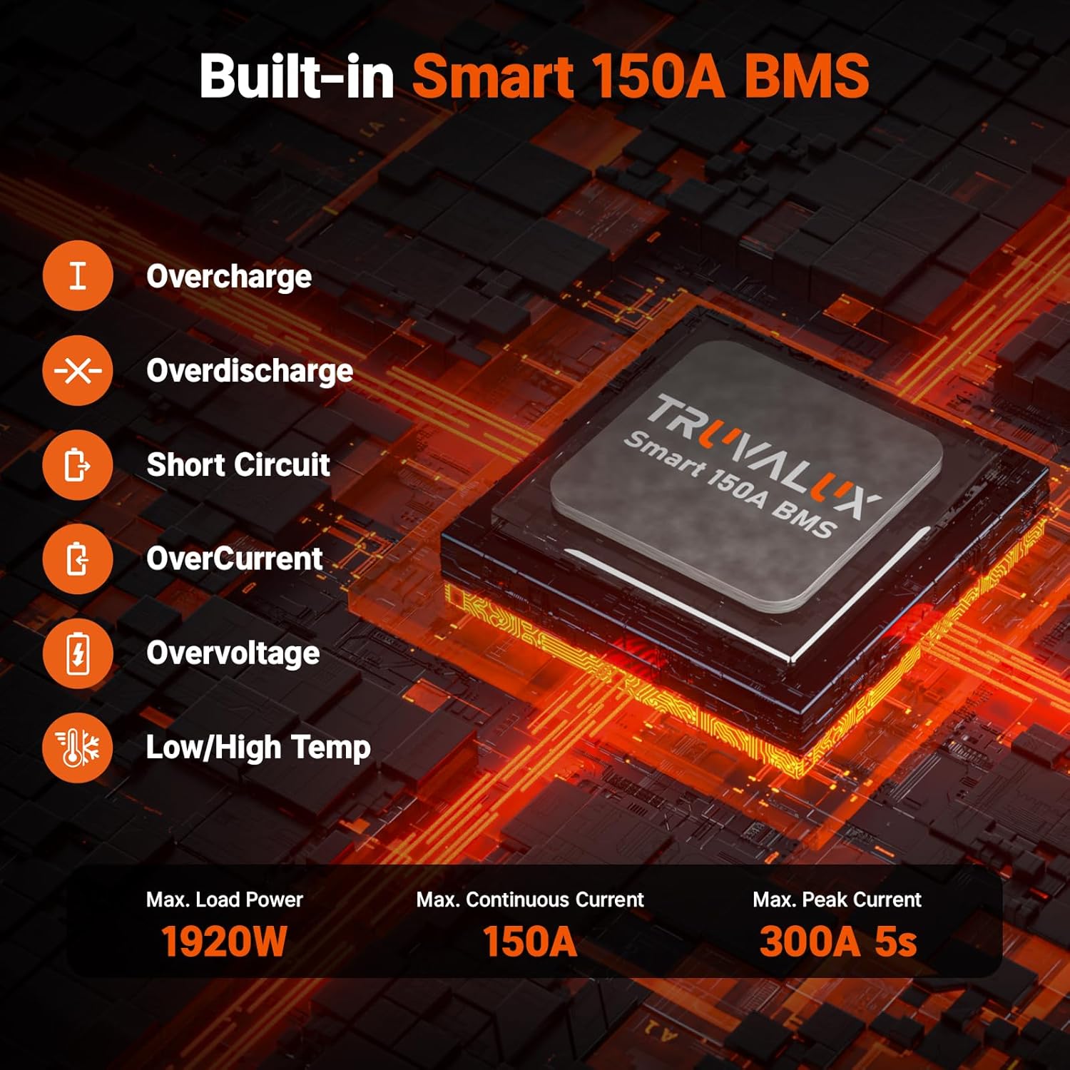 - BLUETOOTH APP MONITORINGăOur lithium batteries 12v 140Ah features an upgraded smart BMS and built-in Bluetooth 5.0. With the TRUVALUX app, you can instantly monitor key metrics like state of charge (SOC), voltage, current, power, and temperature. You can also toggle charging or discharging with a tap (no more guesswork)