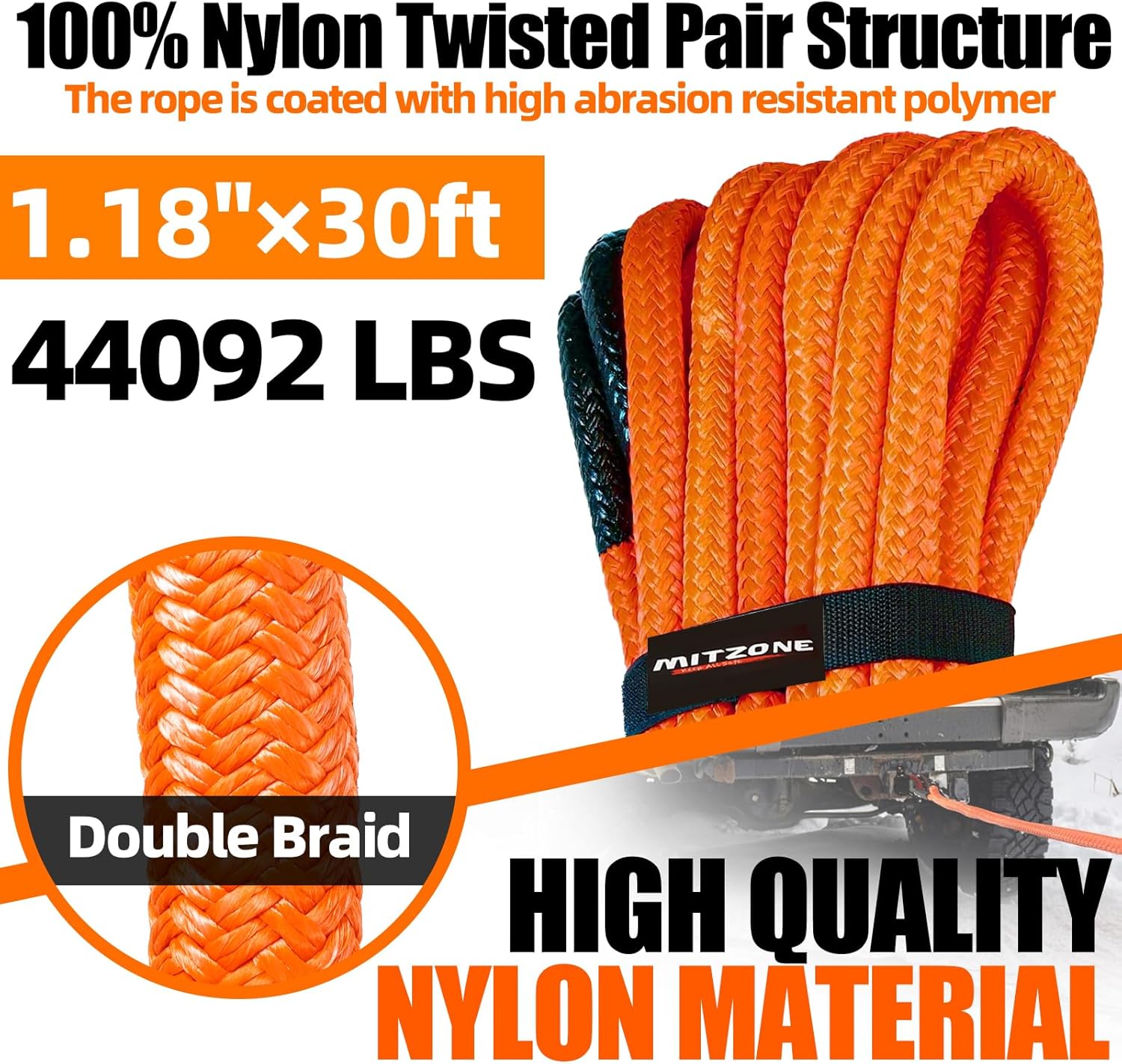 MITZONE Recovery Tow Strap,Heavy Duty Tow Strap Recovery Kit,Car Vehicle Heavy Duty Recovery Rope 44092 lbs for Diesel Trucks,SUV, ATV,Backhoe, Excavators,Ring Shackles,Storage Bag