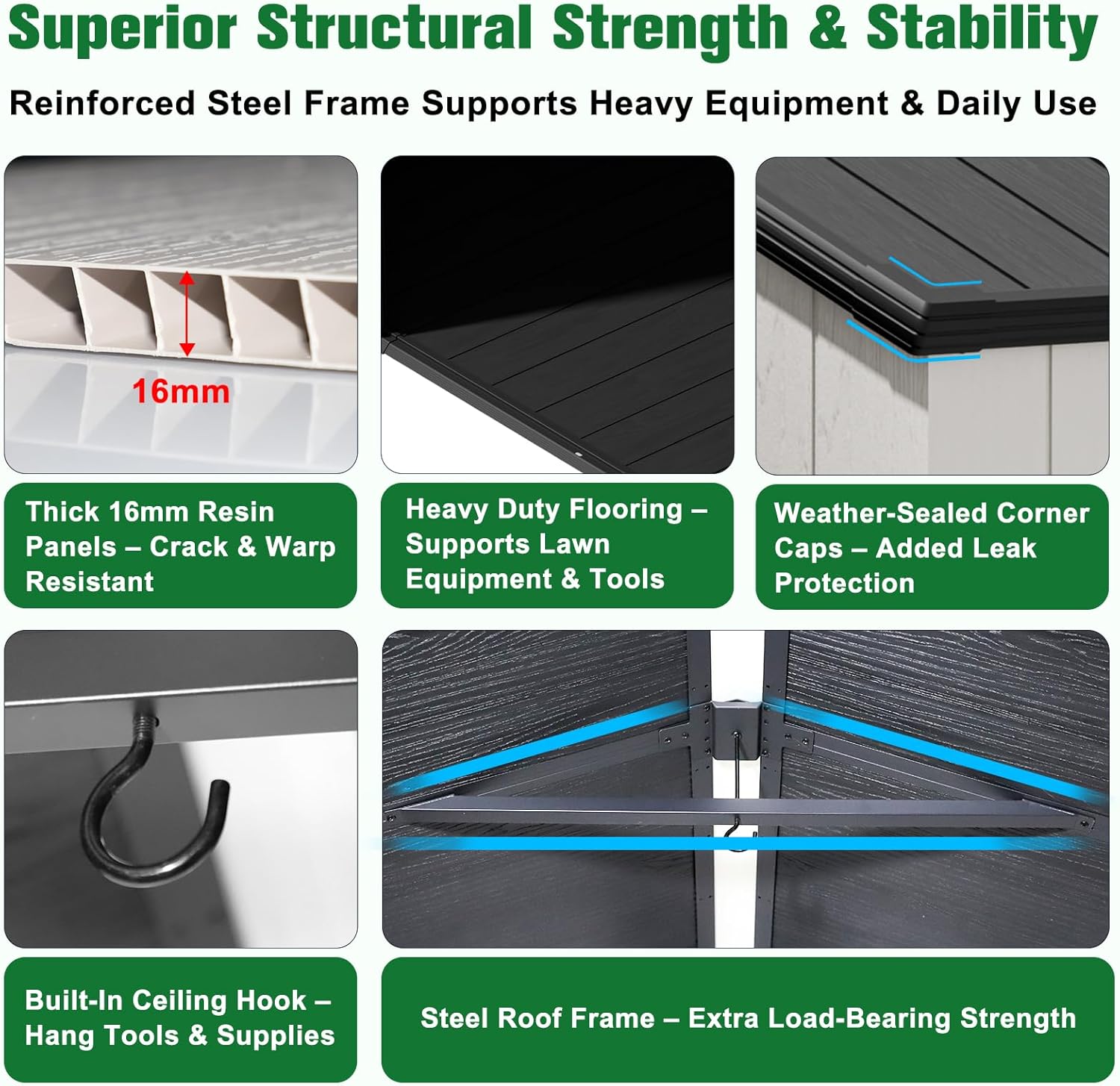 - ALL-WEATHER RESIN CONSTRUCTION: Built with 16mm thick dual-wall polypropylene panels reinforced by a powder-coated steel frame, this outdoor storage shed offers superior strength. Engineered to resist rain, UV rays, and rust while supporting up to 800 lbs of snow load
