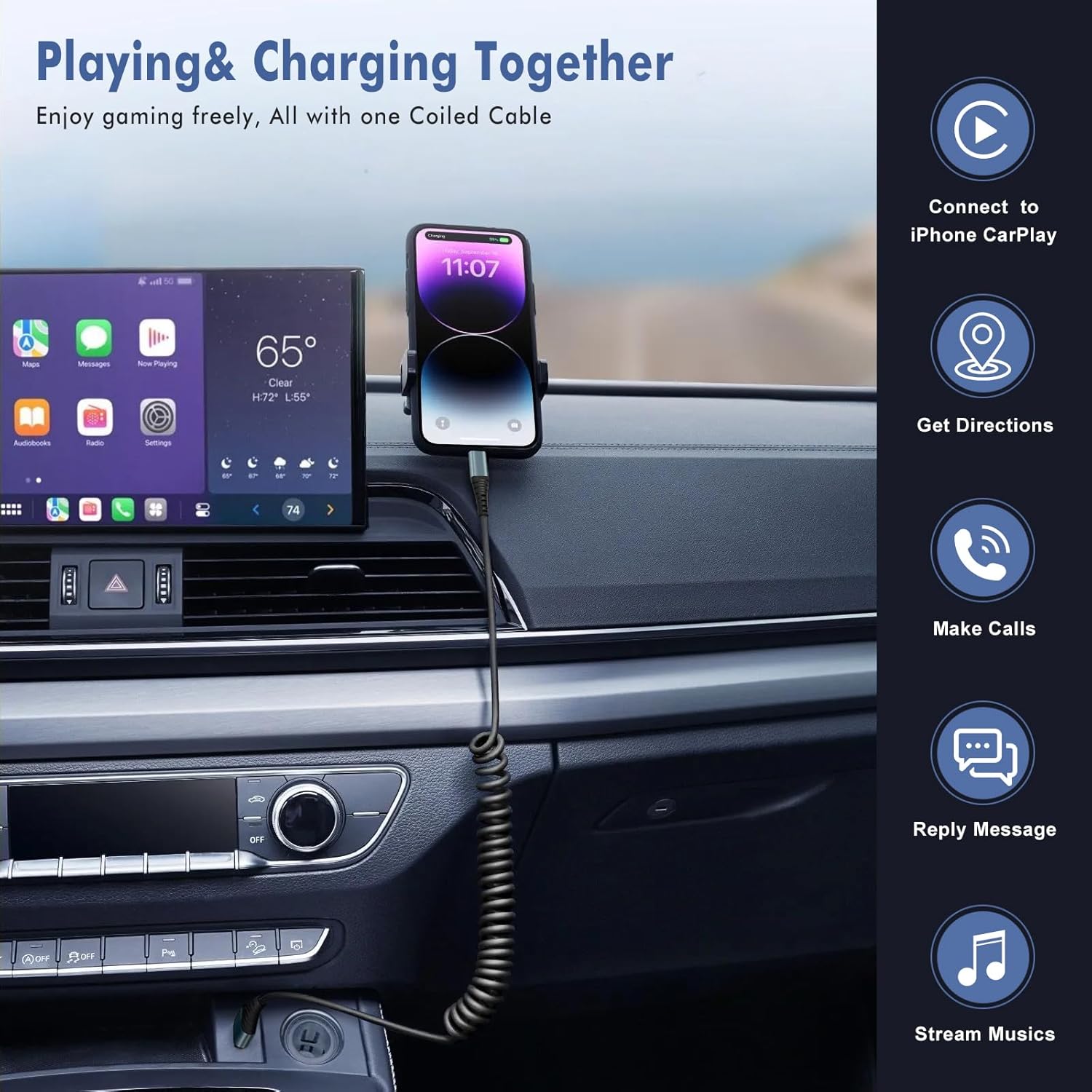 - 【Coiled Lightning Cable】A retractable iPhone car charger designed with high-elasticity TPU material and a spring structure (tested for 20,000+ stretch cycles).The short iPhone charger cord features a flexible coil that resists deformation, smoothly extends from 1ft to 3ft, and saves space while preventing tangles, with its Lightning connector remaining securely attached even on bumpy roads.