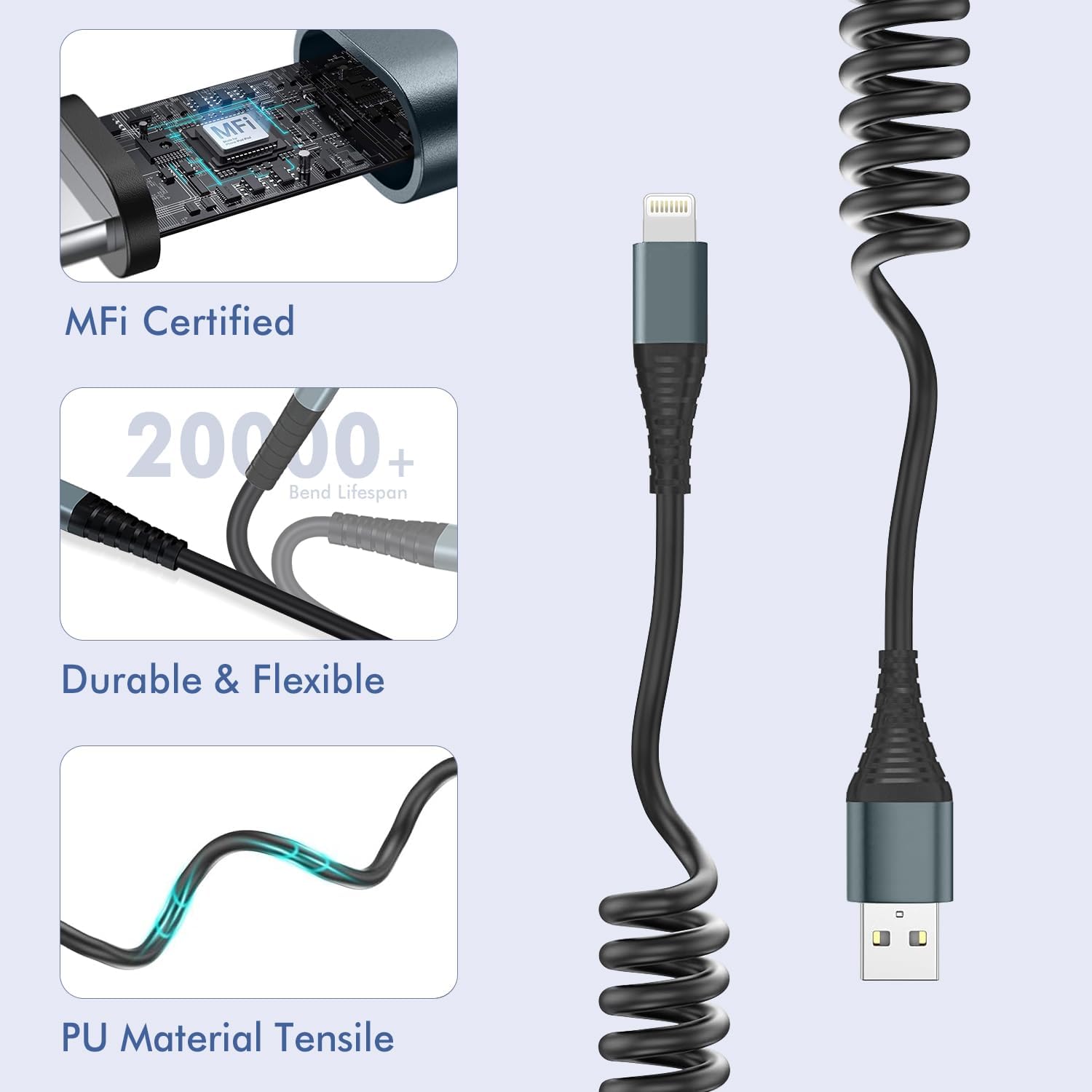 - 【Coiled Lightning Cable】A retractable iPhone car charger designed with high-elasticity TPU material and a spring structure (tested for 20,000+ stretch cycles). The short iPhone charger cord features a flexible coil that resists deformation, smoothly extends from 1.15ft to 6ft, and saves space while preventing tangles, with its Lightning connector remaining securely attached even on bumpy roads.