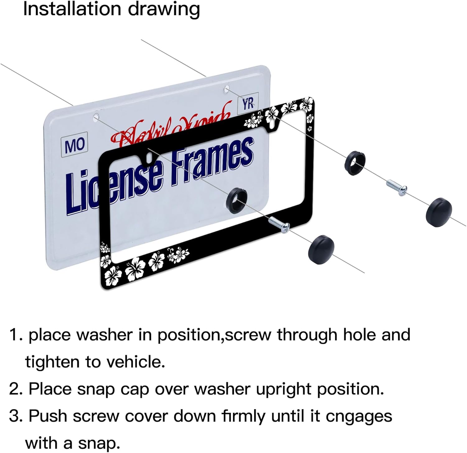 - Hibiscus License Plate frames :You will receive a set of 2 license plate frames,All Accessories Needed are Included (4 Screw Caps,4 Screws,4 Washers),Quick and Simple Installation,you don’t need to buy any other hardware or fasteners,Anti-theft caps are also included.