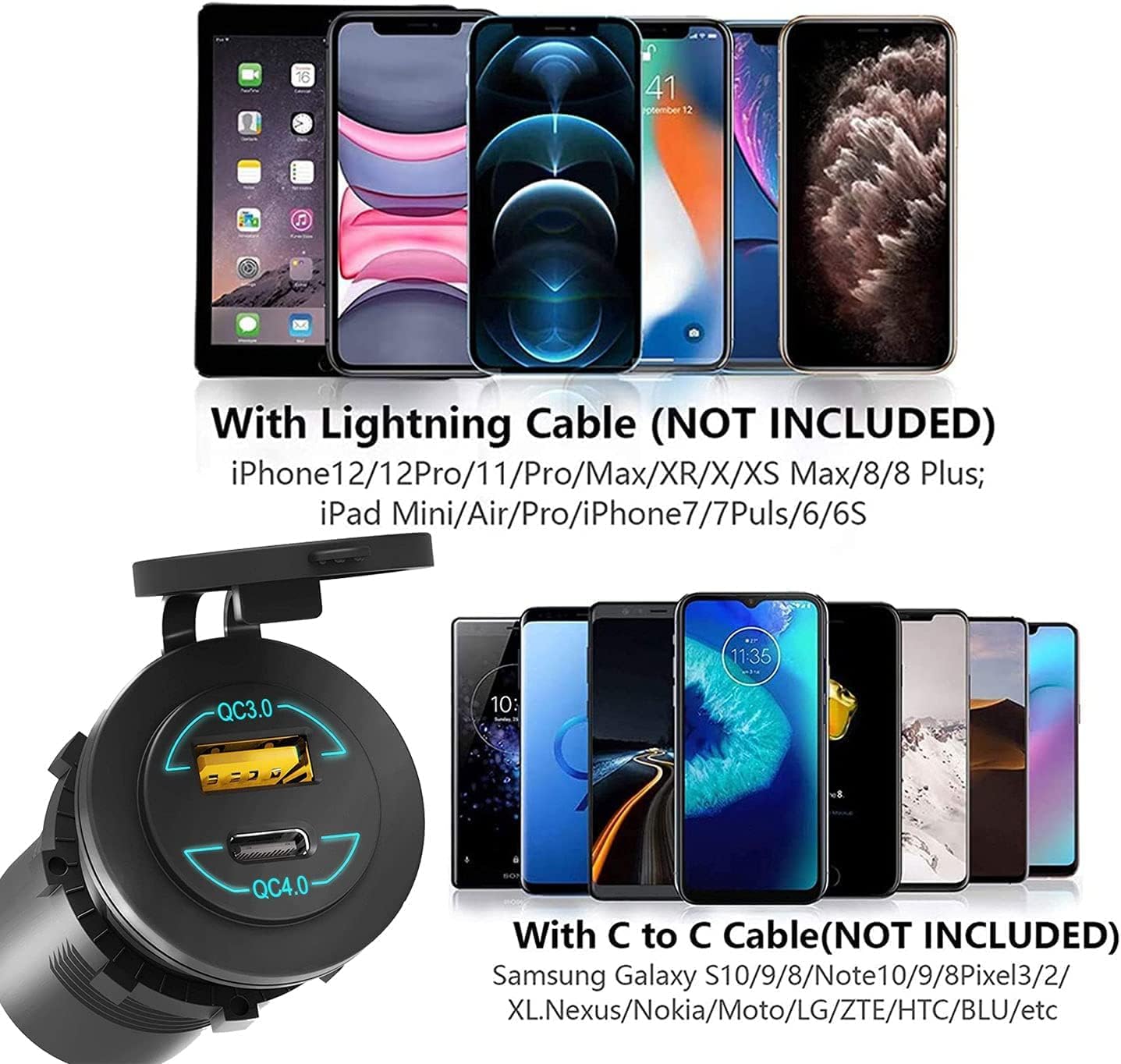 - 【Dual-Protocol Fast Charging】This 12v usb outlet is equip with 60W QC4.0 PD Type-C & 36W QC3.0 USB-A ports, smart IC auto-detects devices for optimized output (5V/9V/12V/15V/20V). Charges laptop, Tablet at 20V/3A while simultaneously fast-charging Compatible with iPhone Series via PD protocol, Requires C-C/Lightning cables