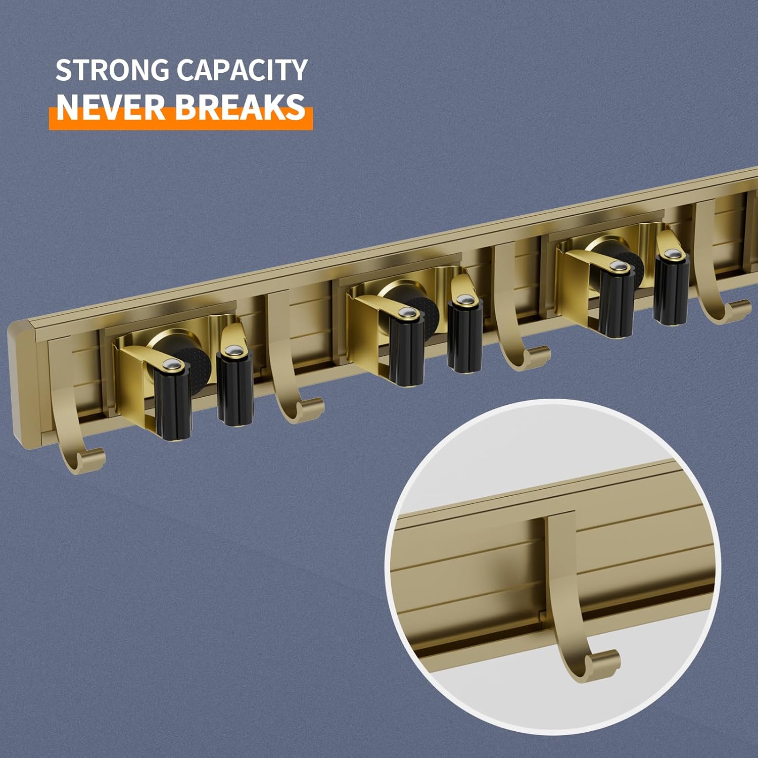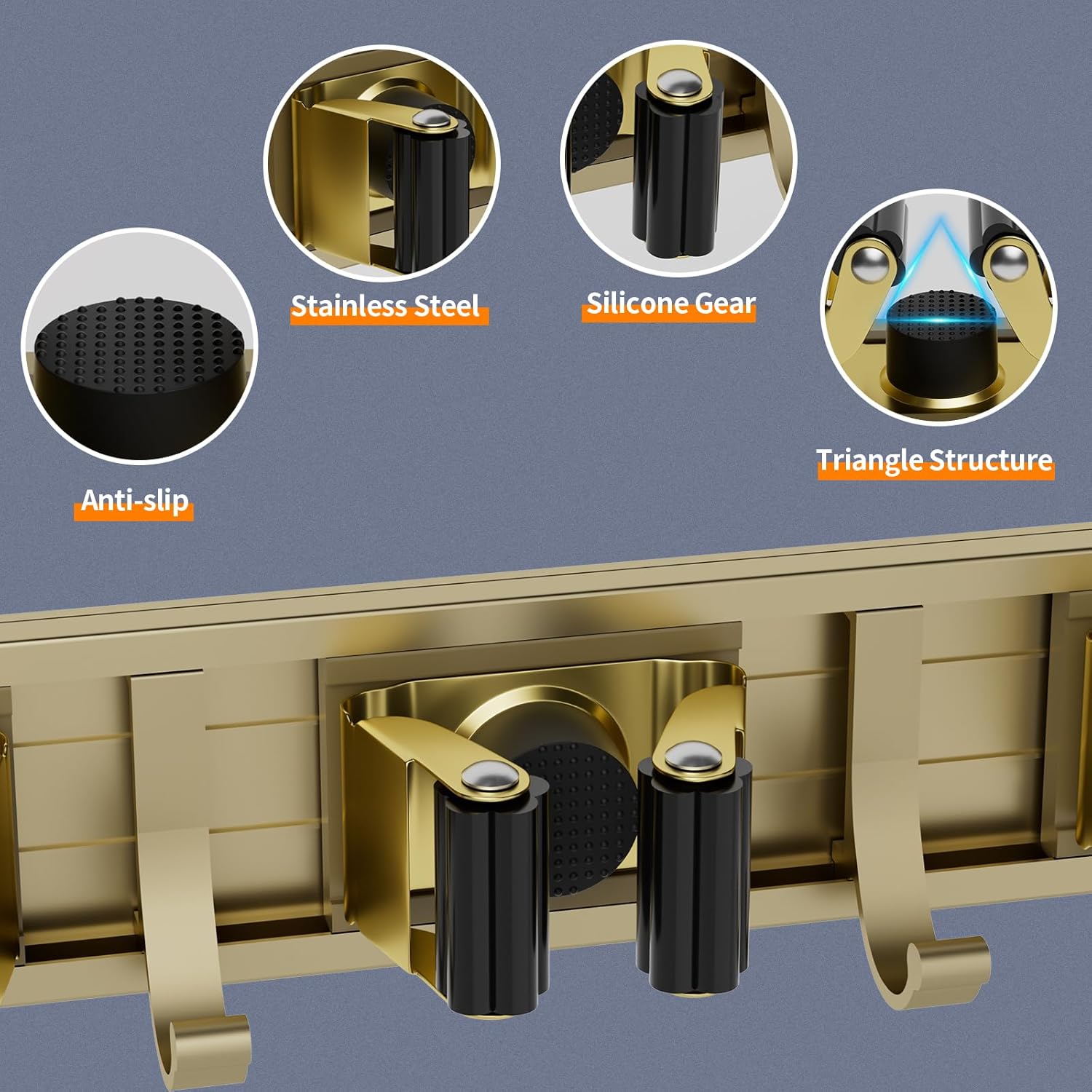 Broom Holder Wall Mount Mop and Broom Hanger Wall Mounted Garage Storage Rack Kitchen Garden Tool Organizer (4 Racks with 5 Hooks, Bronze)