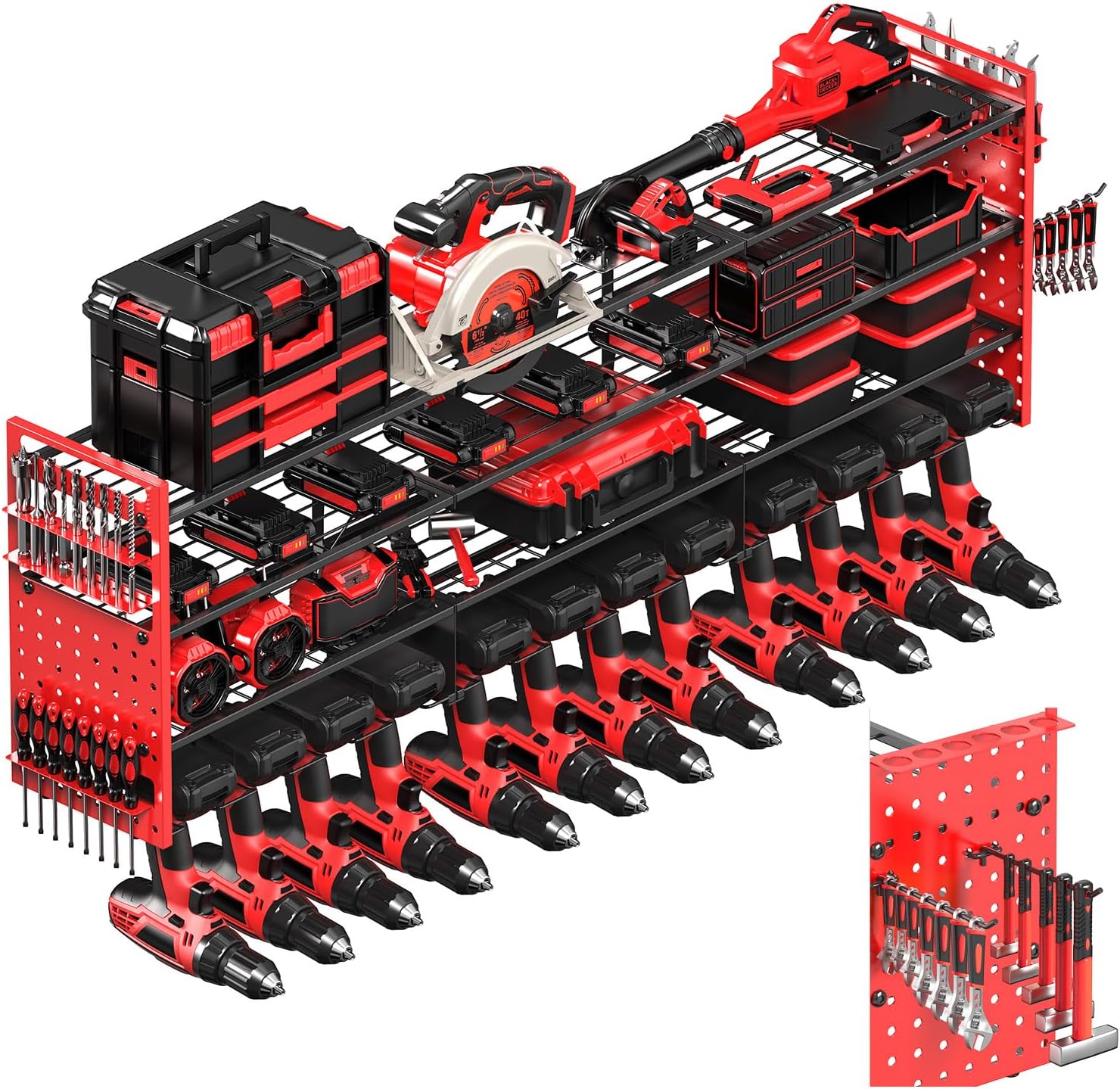 - 💪【 52.4" 4-Tier Power Tool Organizer Storage with 12 Cordless Drills Rack】 This power tool organizer wall mount features a 4-tier structure with a total length of 52.4 inches. Store up to 12 Cordless Drills on the bottom tier, with spacious compartments above for batteries, toolboxes, hammers, angle grinders, heat guns, and more. Ideal for keeping every tool within reach and your garage clutter-free.