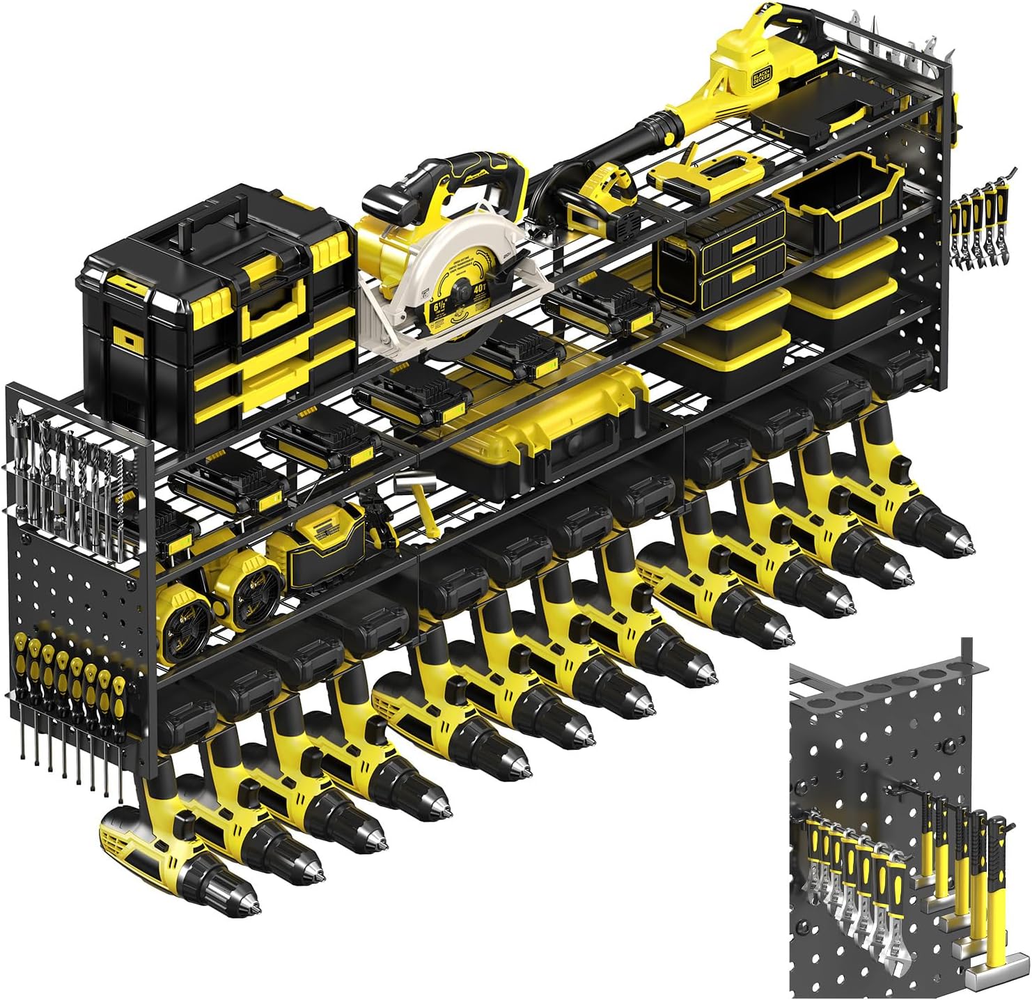 - đȘă52.4" Large 4-Tier Power Tool Organizer with 12 Drills Holderă This power tool organizer wall mount features a 4-tier structure with a total length of 52.4 inches. Store up to 12 drills on the bottom tier, with spacious compartments above for batteries, toolboxes, hammers, angle grinders, heat guns, and more. Ideal for keeping every tool within reach and your garage clutter-free.