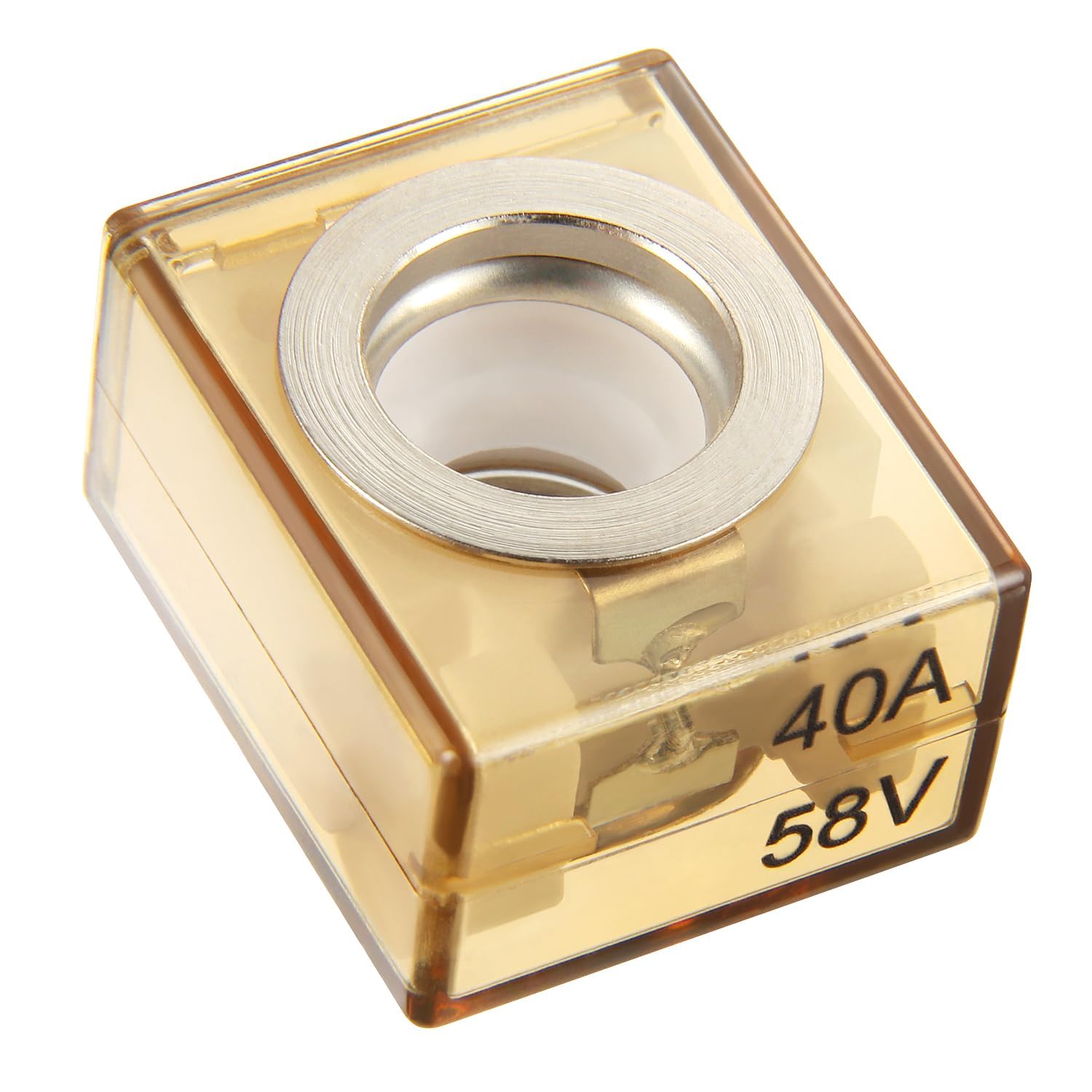 - 【Reference data】:Fuses have a Max Voltage Rating: 58V –– Fuse Holder have an Amperage Rating:40A – Fuses Holder Stud Size: M8 (5/16") –– Fuse Holder Mounting Hole: M10 (3/8")
