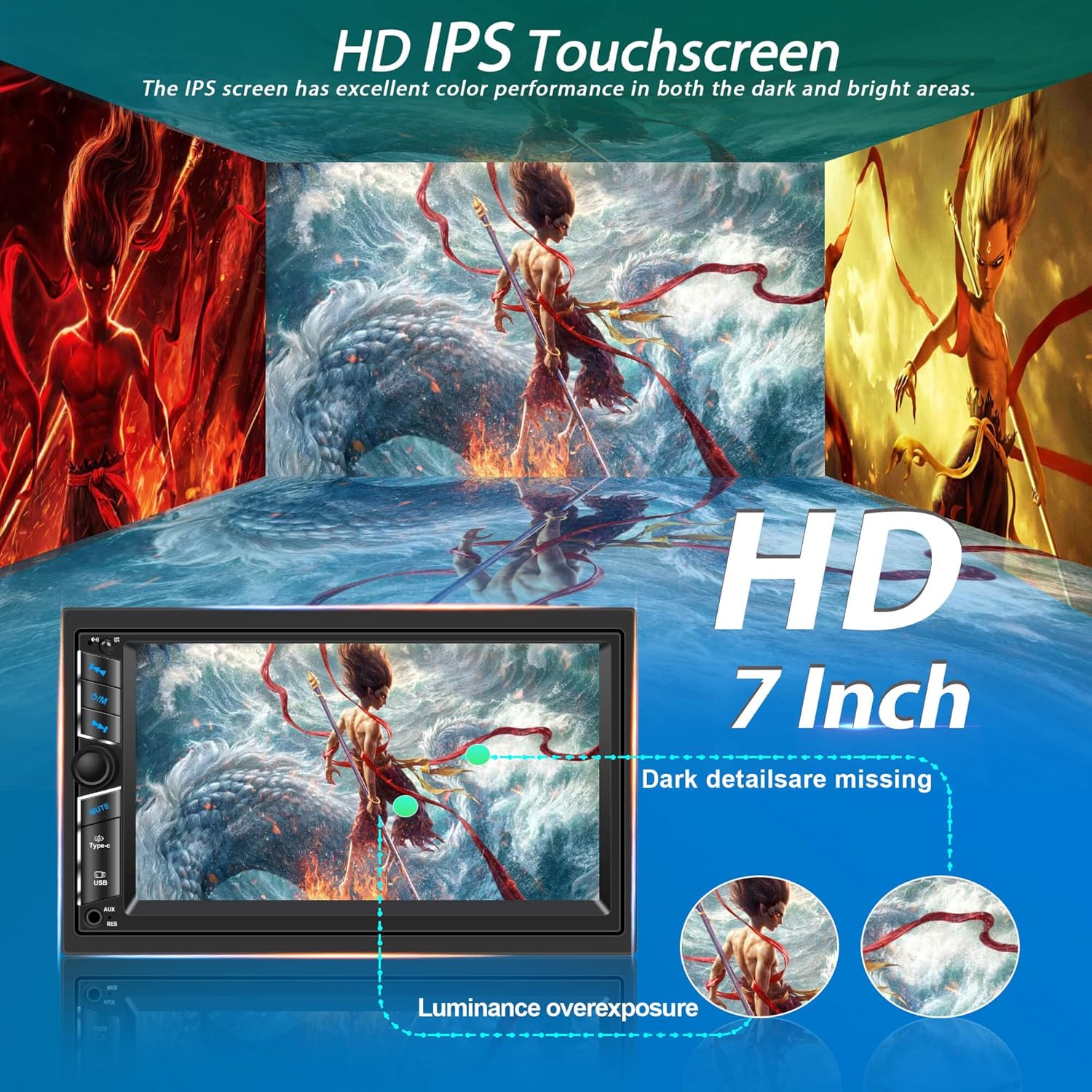 - 2. 7" HD IPS Touchscreen (1024x600) - Double din car stereo Apple CarPlay features crisp visuals, responsive capacitive touch, and wide viewing angles.