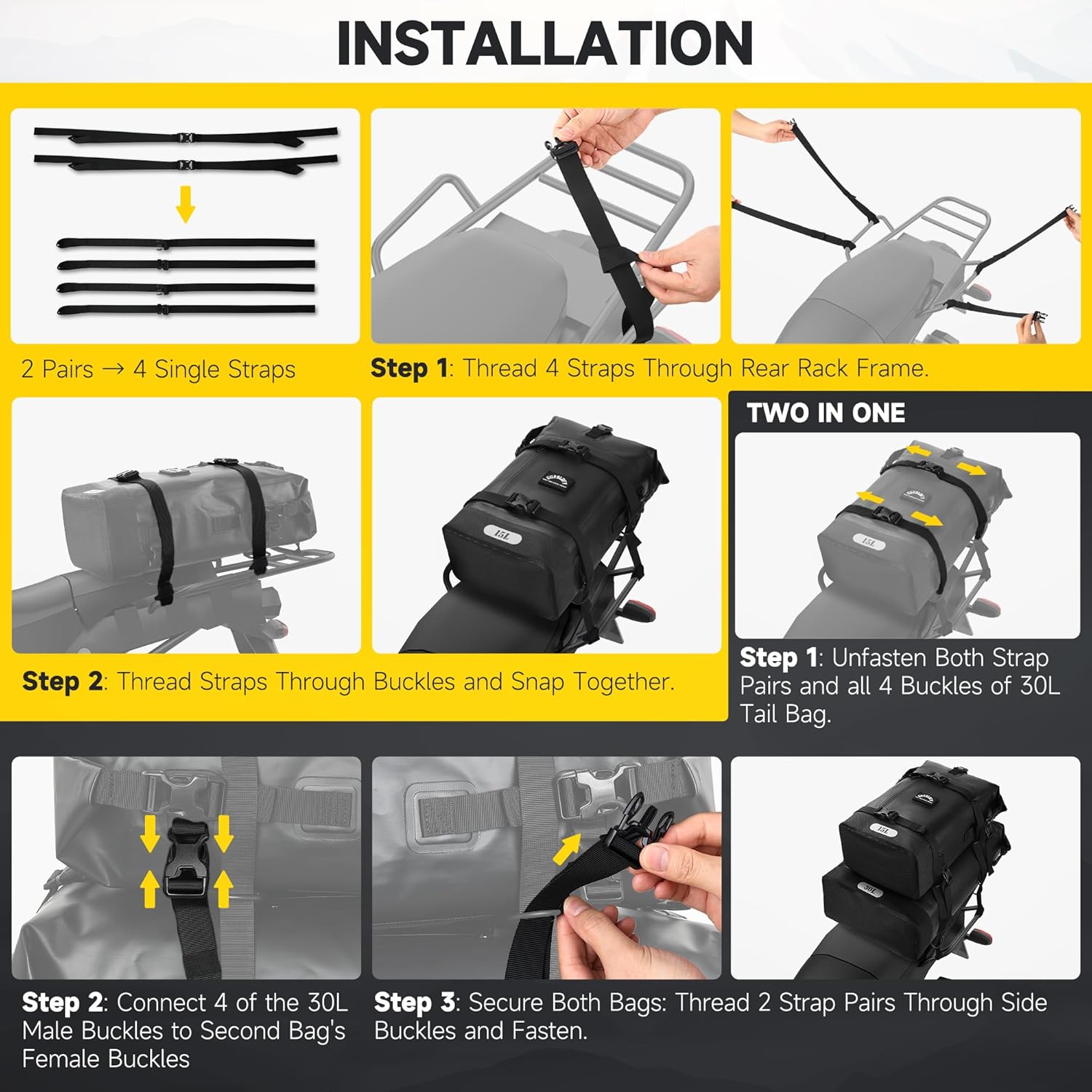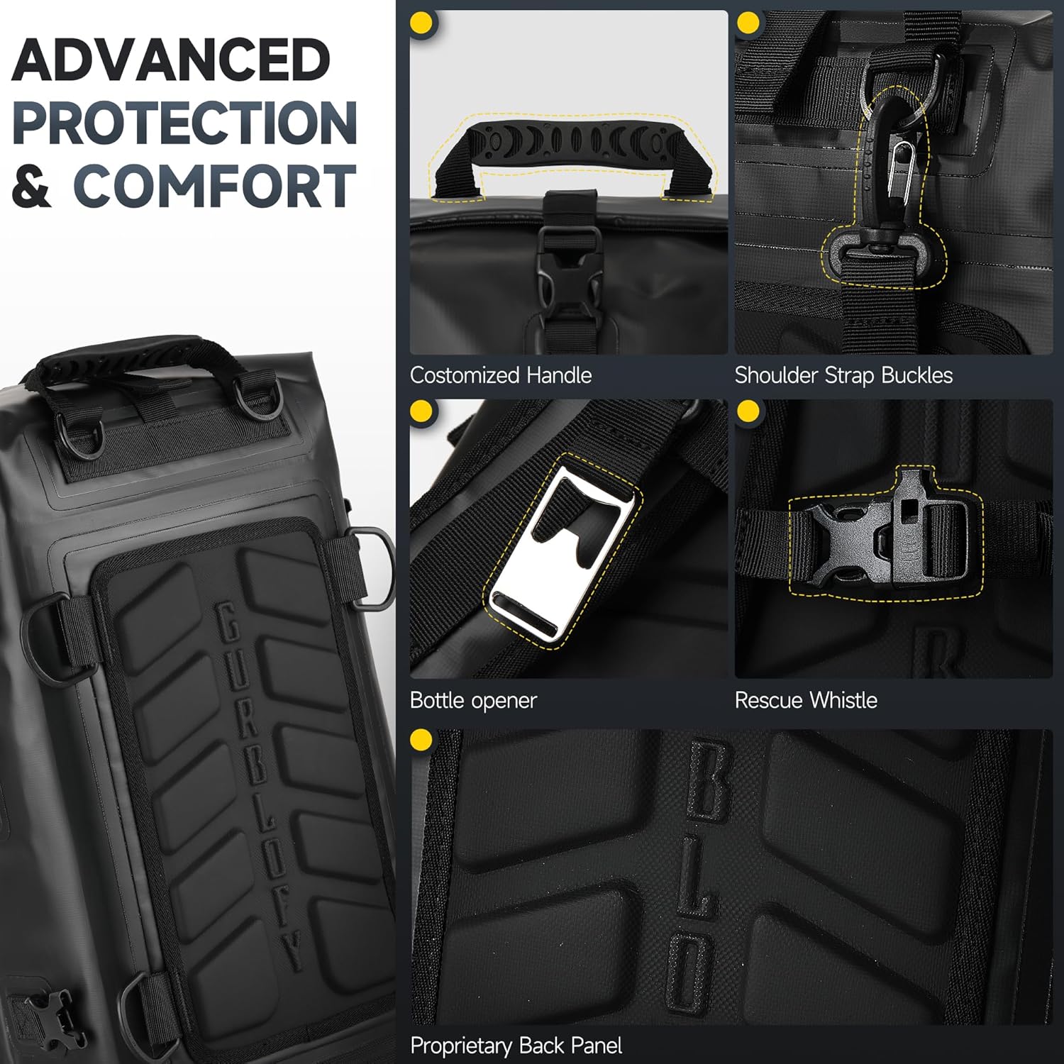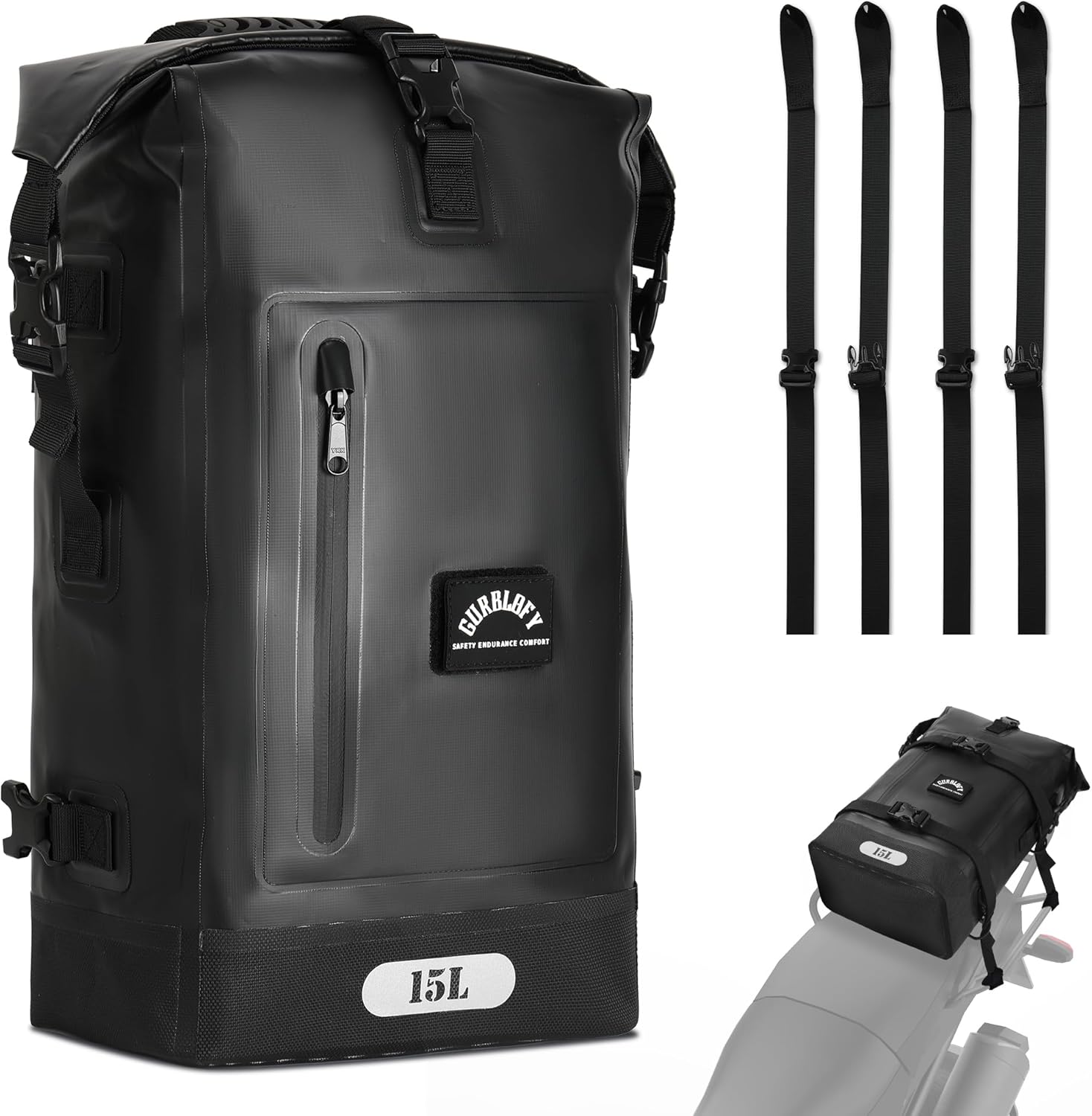 - Rider-Optimized Functional Design. The Gurblofy motorcycle tail bag is engineered with the rider in mind: Its heavy-duty PVC construction withstands all weather conditions, while storm-proof zippers ensure secure closure. The pack features quick-adjust buckles for instant sizing, and our patented textured handle design delivers a firm grip even with gloves. Multi-position straps distribute weight evenly across your back for fatigue-free riding adventures.