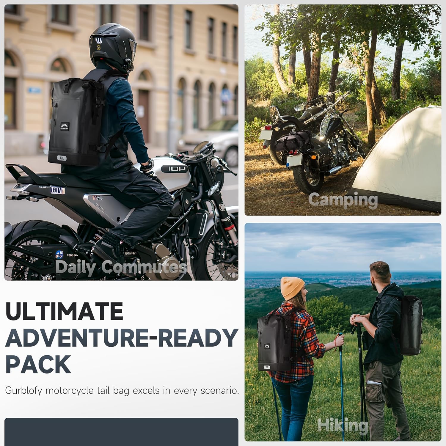 - Ultimate Adventure-Ready Pack. Designed to adapt to your lifestyle, the Gurblofy motorcycle travel bag excels in every scenario: Safely carry work essentials during daily commutes, pack hiking gear for weekend escapes, or load camping equipment for moto-adventures. Its universal mounting system fits all motorcycles, scooters and ATVs, ready to tackle city streets or mountain trails with you.