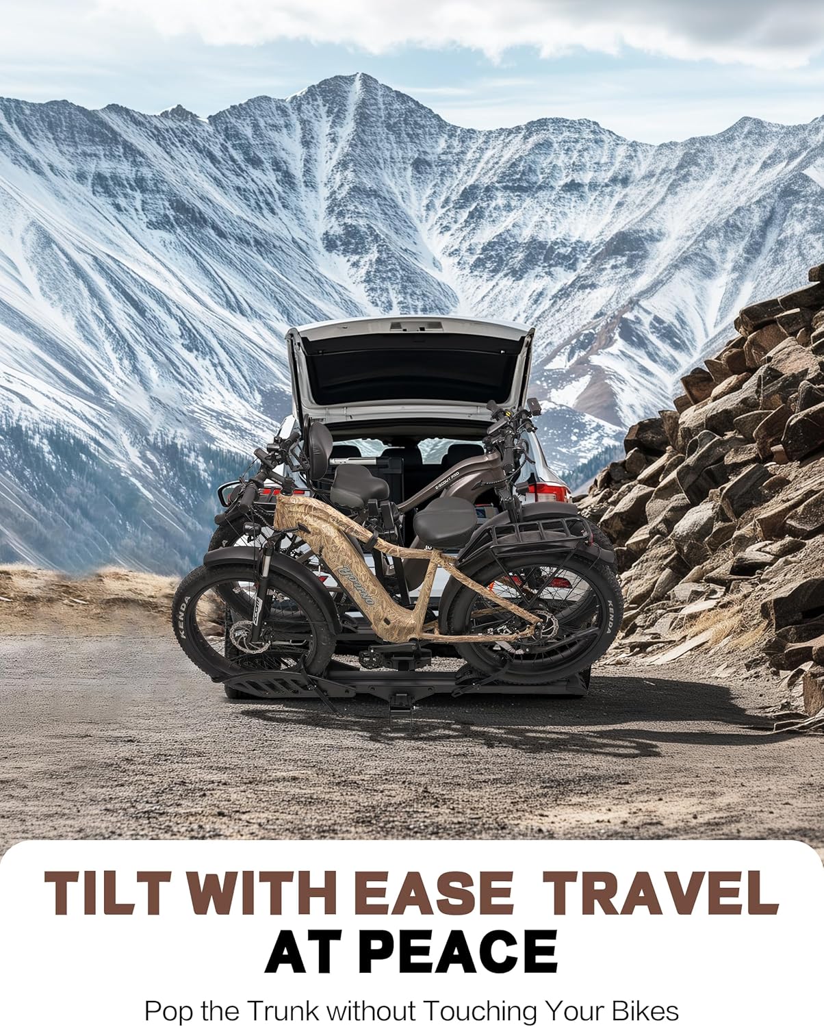 E-Bike Rack with Ramp, Hitch 2 Bike Rack, 200 lbs Capacity Electric Bike Carrier, Foldable Platform Mount for Cars, Trucks, SUVs, Minivans, Up to 5-Inch Fat Tire for 2'' Receiver