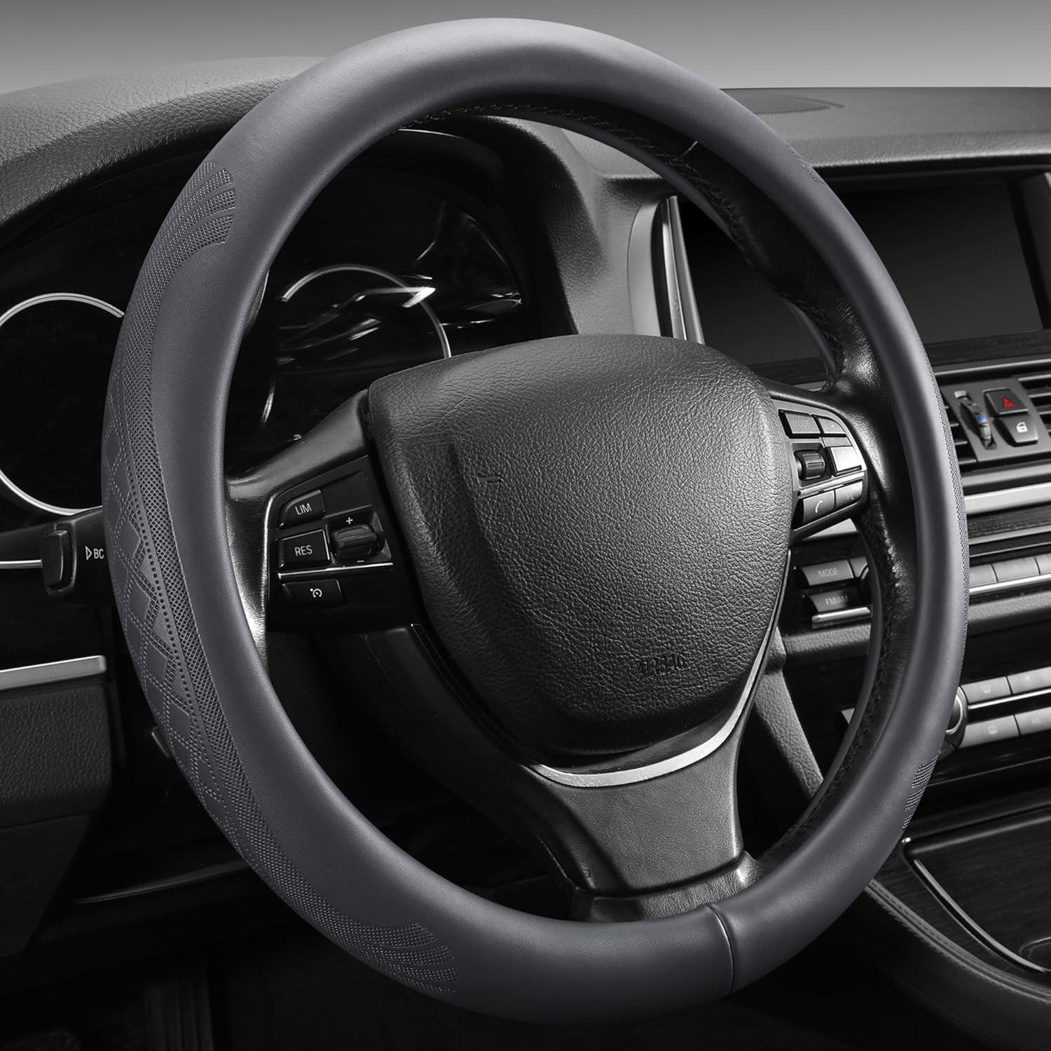 【2025 Model】 Real Cowhide Steering Wheel Cover for Men Women,Gray Genuine Leather Steering Wheel Cover for Cars,Universal 14.5-15 inch Steering Wheels,Grid & Square Motif