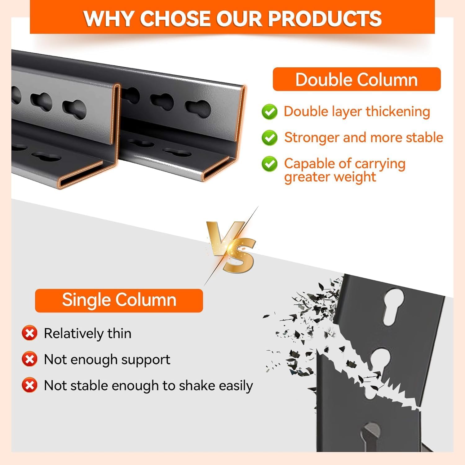 - 【 Upgraded Dual-Layer Columns for Enhanced Stability】 Unlike standard shelves on the market that use single-layer columns, our product features upgraded dual-layer columns that significantly boost stability and load-bearing capacity. The reinforced structure helps distribute the weight evenly, reducing the risk of warping or sagging over time. This ensures the shelf remains stable even under heavier loads. In comparison, shelves with single-layer columns can wobble or bend when storing heavier items, making them less reliable for larger, bulkier tools or materials