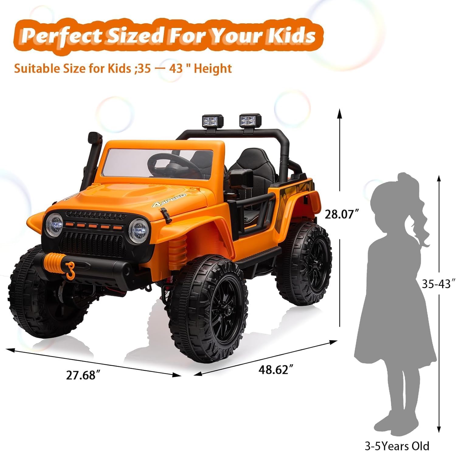 - 【SPECIFICATIONS】Overall size: 48.62"*27.68"*28.07"(L x W x H). Maximum Load: 220LBS. Speed: 2-4 MPH(3-7KM/H). Motor: 24V/ 4X55W. Playtime: 1~2 Hours(Fluctuates according to factors like load, speed, road surface & temperature). Other Functions: Wireless music player, powerful truck lights and real car engine sound.