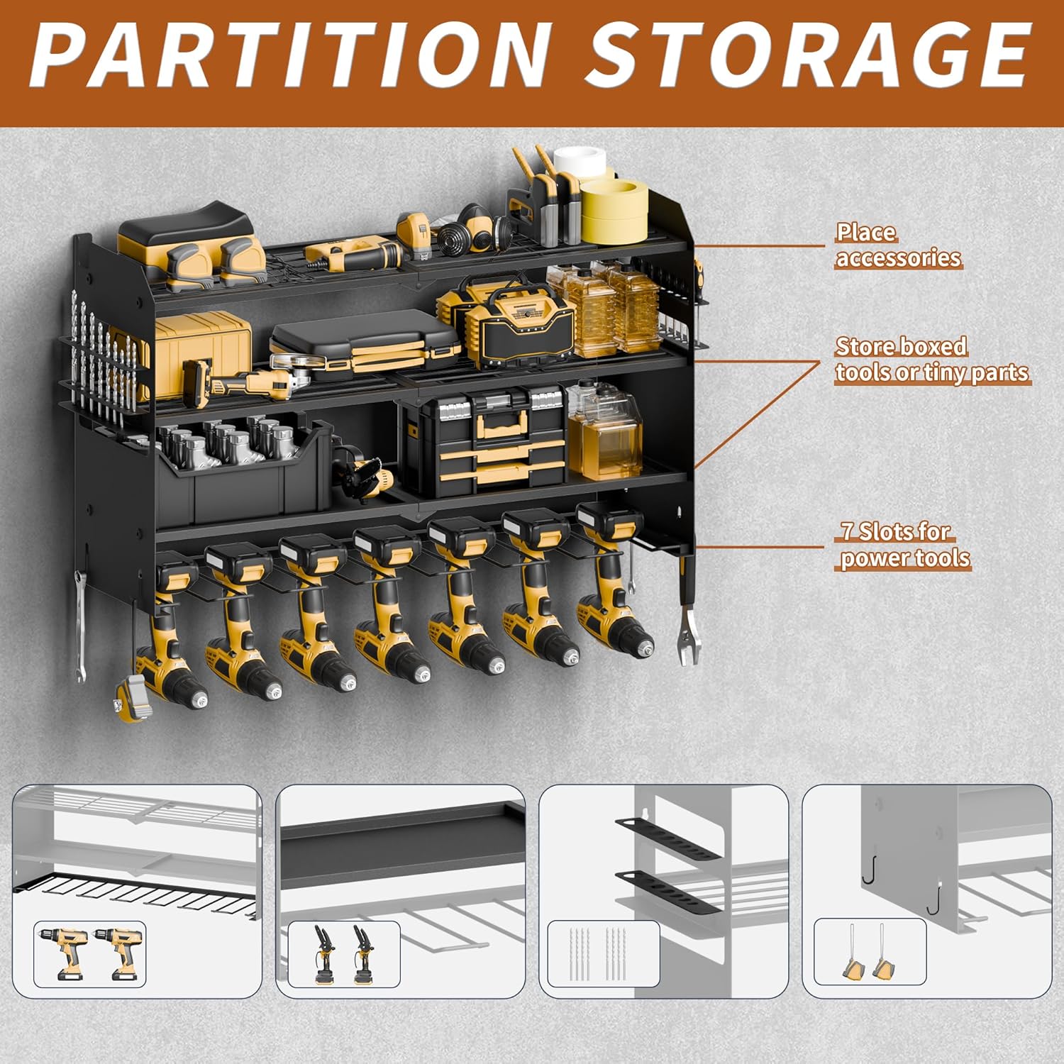 - Special Feature : 4 layer, 7 cordless drills holders, Easy to Install