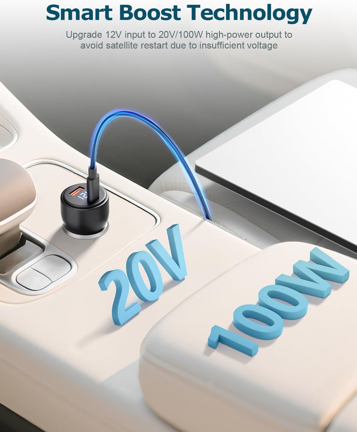 - 【What You Will Receive】1 * 5.9FT starlink mini usb c to dc power cable; 1 * cigarette lighter adapter 12v-24v . Starlink mini car charger adopts intelligent boost technology, which can output a maximum power of 20V/100W when the input voltage is greater than 12V. To avoid issues such as satellite restarts caused by insufficient voltage. It supports three in one power supply: charging starlink mini dish, USB-C (100W), and USB-A (18W) devices.