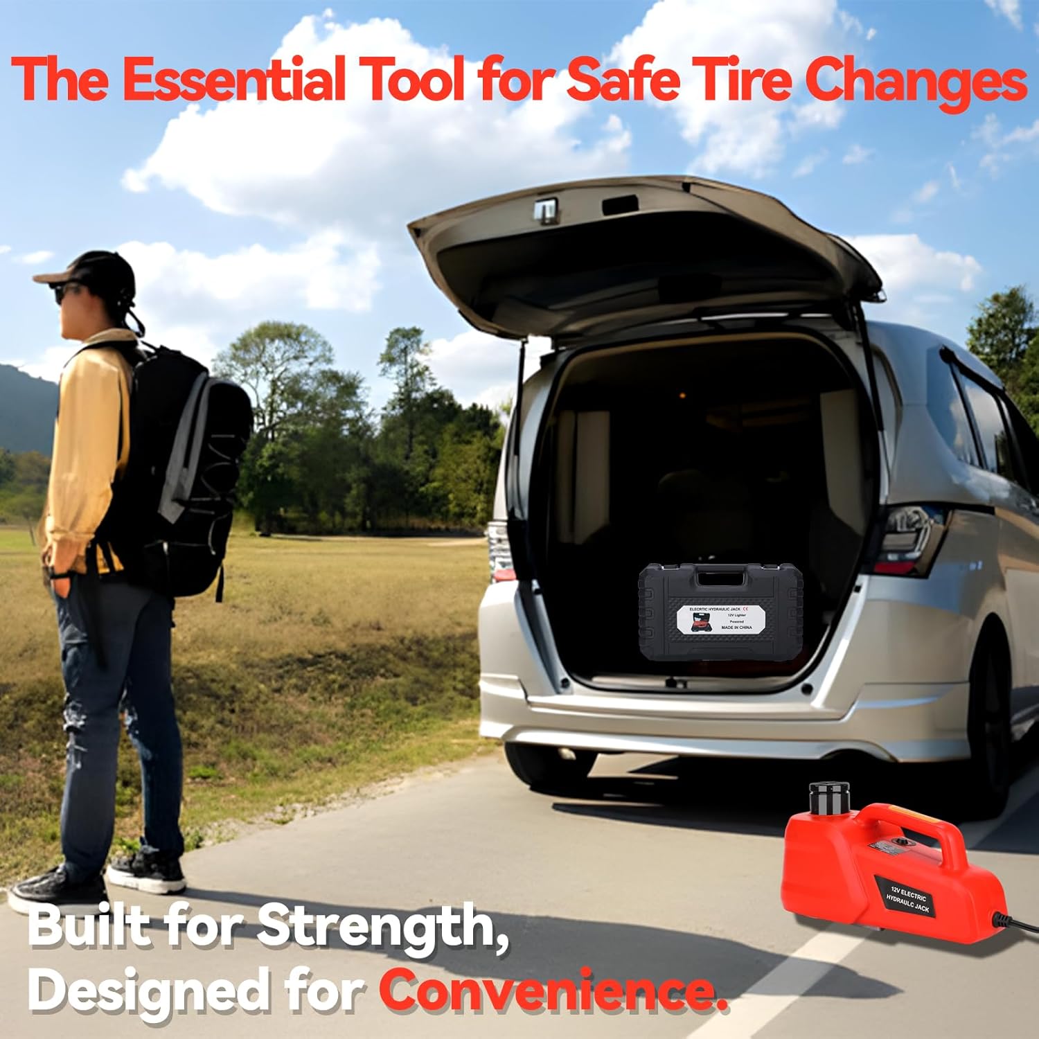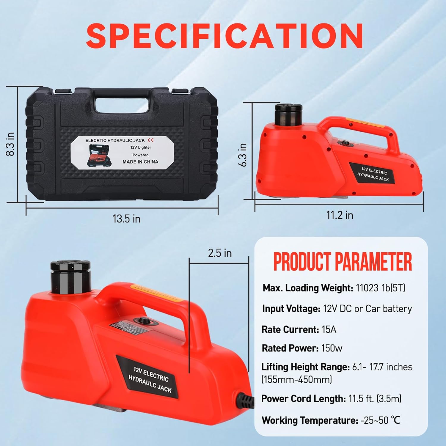 - Powerful Electric Car Jack: This 5-ton (11023 lbs) hydraulic jack features a built-in motor and lifts most vehicles from 6.1" to 17.7" in 2 minutes. Enables fast, efficient tire changes anywhere — roadside, parking lot, or garag