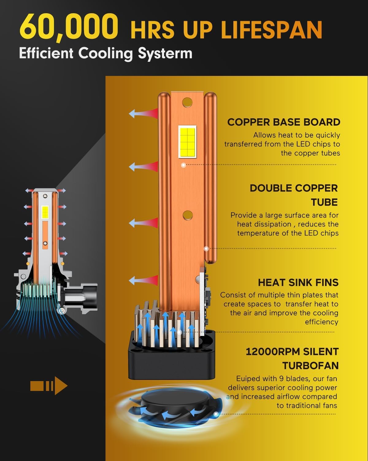 - Efficient Thermal Management Combined with silent high-speed fans rotating at 18,000 RPM, for rapid heat dissipation and ideal operating temperatures. The headlight modification kit and/or headlight components used for road vehicles must comply with federal motor vehicle safety standards, prevents overheating, and extends service life.