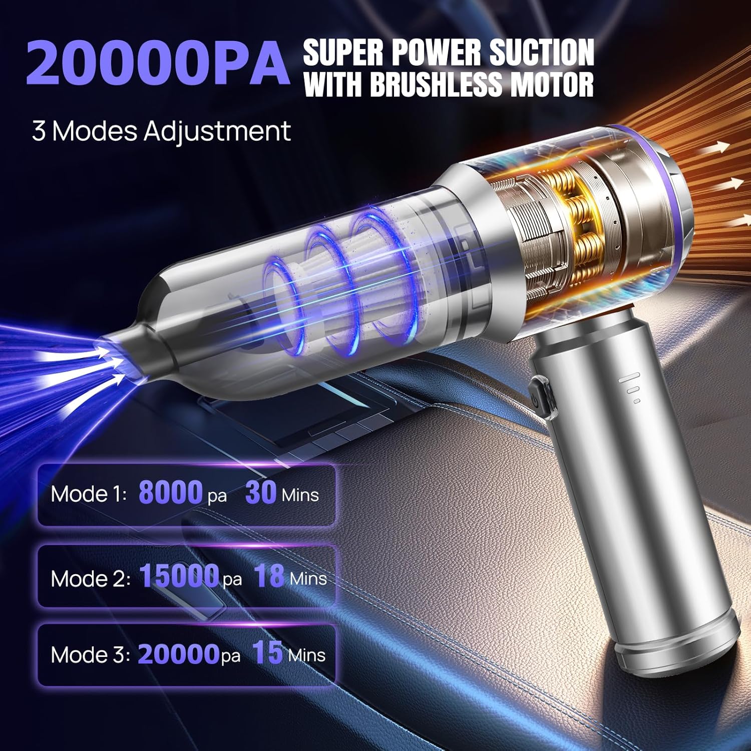 - ă3 Adjustable High Suction ModesăThis mini car vacuum cleaner is equipped with an upgraded 110W powerful and high-speed brushless motor and advanced noise reduction technology, providing powerful performance and reducing the noise to less than 70 decibels. This cordless car vacuum cleaner has 3 adjustable suction modes (8000PA, 15000PA and 20000PA), you can choose the appropriate mode to clean pet hair, crumbs, dust and sand hidden in car seats or sofas.