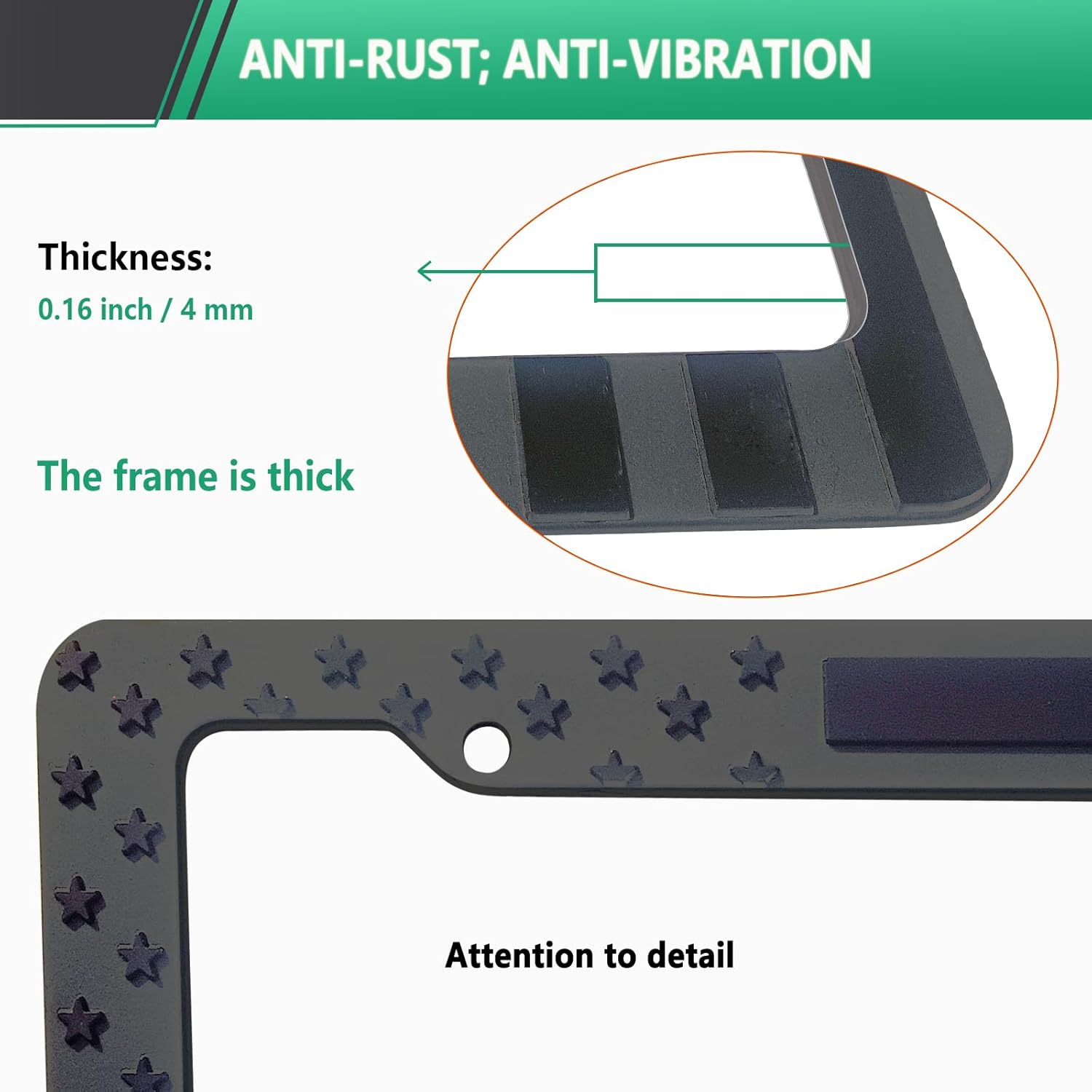 - American Flag License Plate Frame: Featuring embossed 3D stars and stripes with gloss accents on a matte plastic base.The car plate frames are made of light yet durable plastic, avoiding any potential issues metal or aluminum may cause with scratching your vehicle paint or rusting