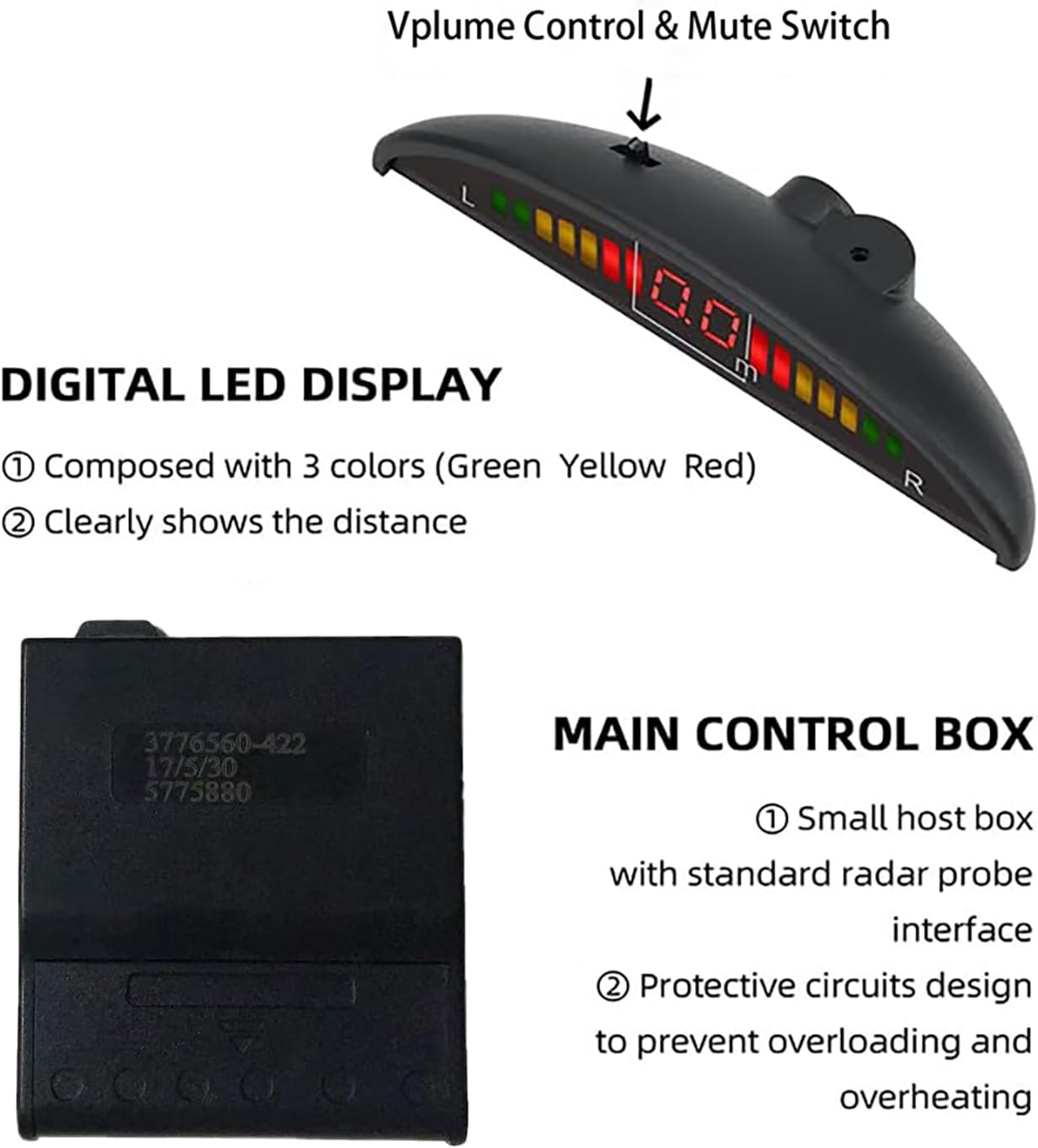 - 【Car radar System】The LED Display with 3 colors can both shows distance data and warn you with beep sound. Beep sound warning will be more frequent when distance is getting closer. The combination of digital data and Beep sound design gives you a double guarantee of travel