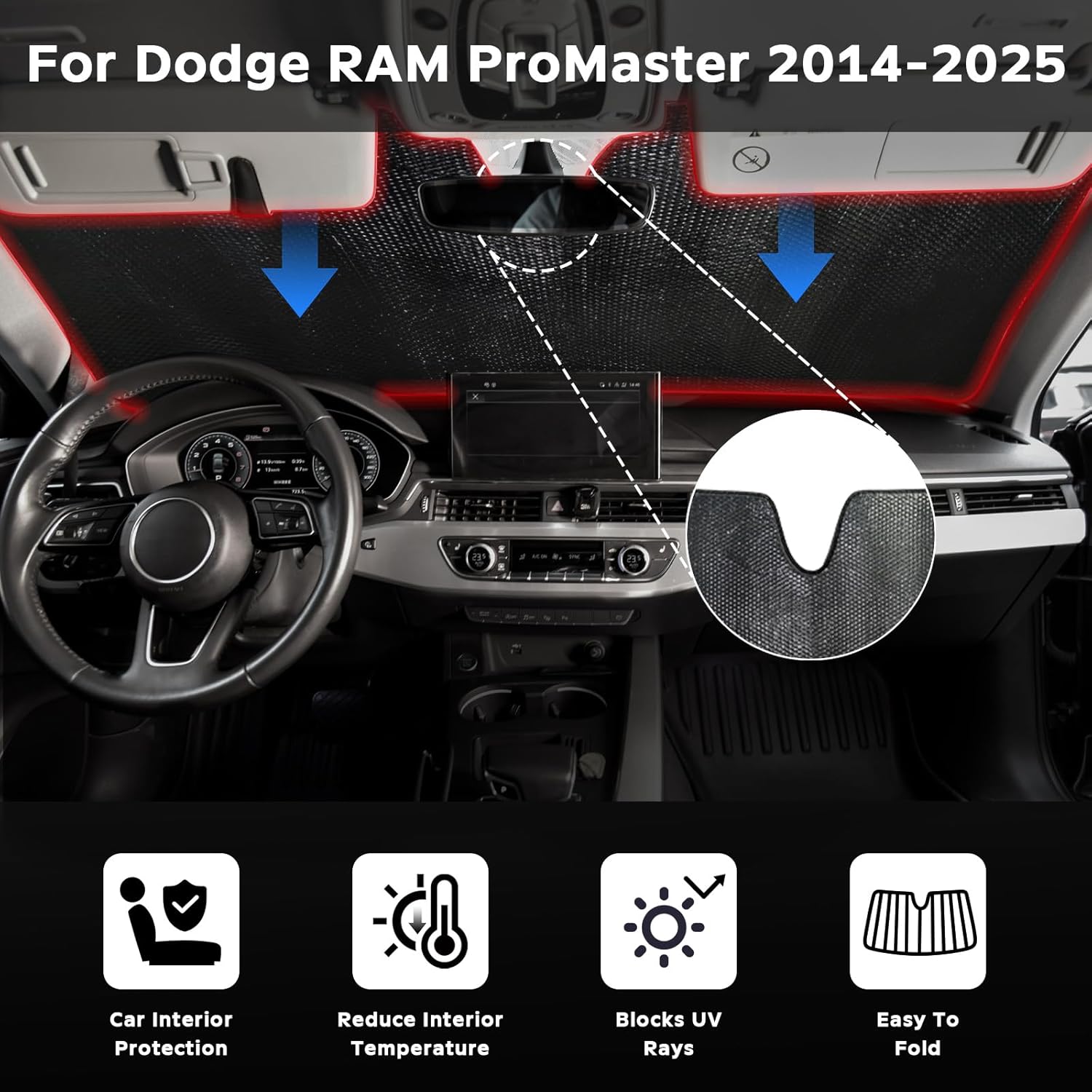 - Precise Fit: This sunshade designed specifically for the Dodge RAM ProMaster 2014-2025 front windshield. Blocks 99% of infrared radiation; reduces interior temperature. Protects dashboard/leather from radiation and high temperatures, preventing cracking