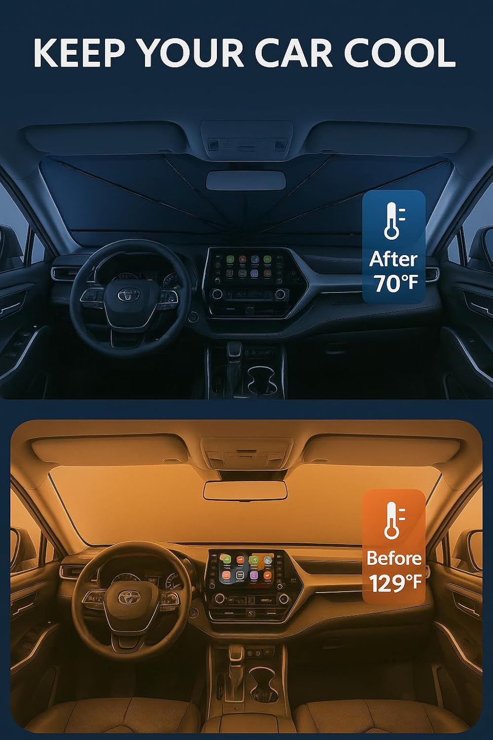 - Certified Sustainable. Customized Windshield Sunshade: Specially designed for the 2020-2025 Toyota Grand Highlander with precise mirror cutouts, providing 100% shading, carbon fiber handle, ensuring lightweight and durability while also having a fashionable feel. Our Highlander windshield sunshade can protect the interior of your car from various light damage and prevent dashboard and seat degradation.