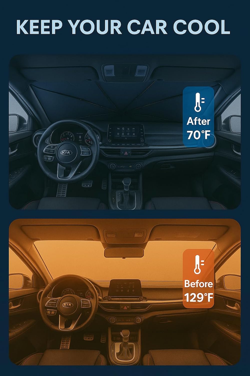 - Certified Sustainable. Customized Windshield Sunshade: Specially designed for the 2019-2025 Kia Forte with precise mirror cutouts, providing 100% shading, carbon fiber handle, ensuring lightweight and durability while also having a fashionable feel. Our Forte windshield sunshade can protect the interior of your car from various light damage and prevent dashboard and seat degradation.