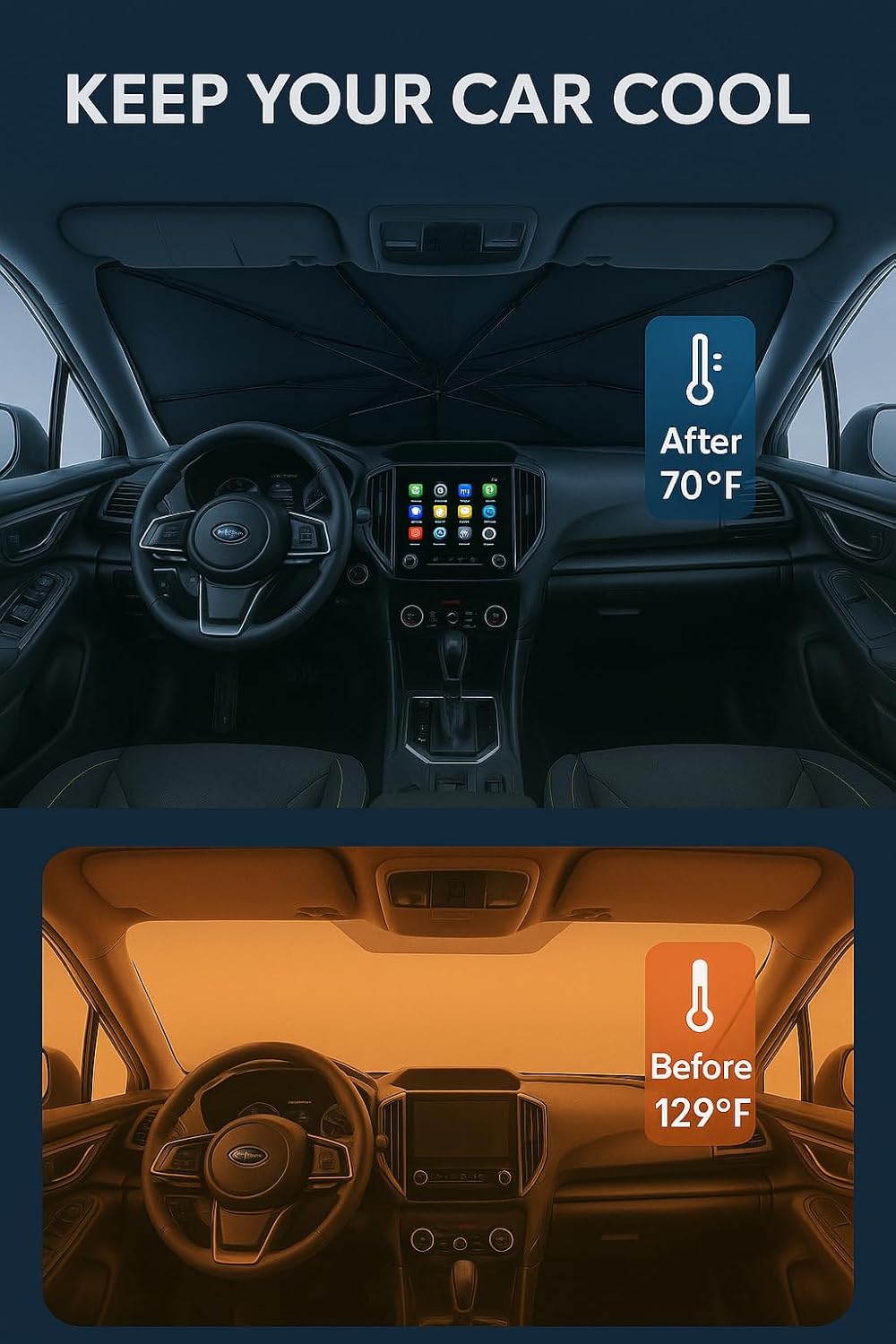- Innovative Ice Crystal Material: The sunshade adopts a 4-layer design, which is thick enough to effectively block and reflect sunlight. After multiple uses, it is still strong and not easy to tear. The sunshade also uses innovative ice crystal materials to evenly distribute heat, quickly cool down, and keep your car cool all the time. You no longer have to worry about getting your seat or car handle scalded by high temperatures.